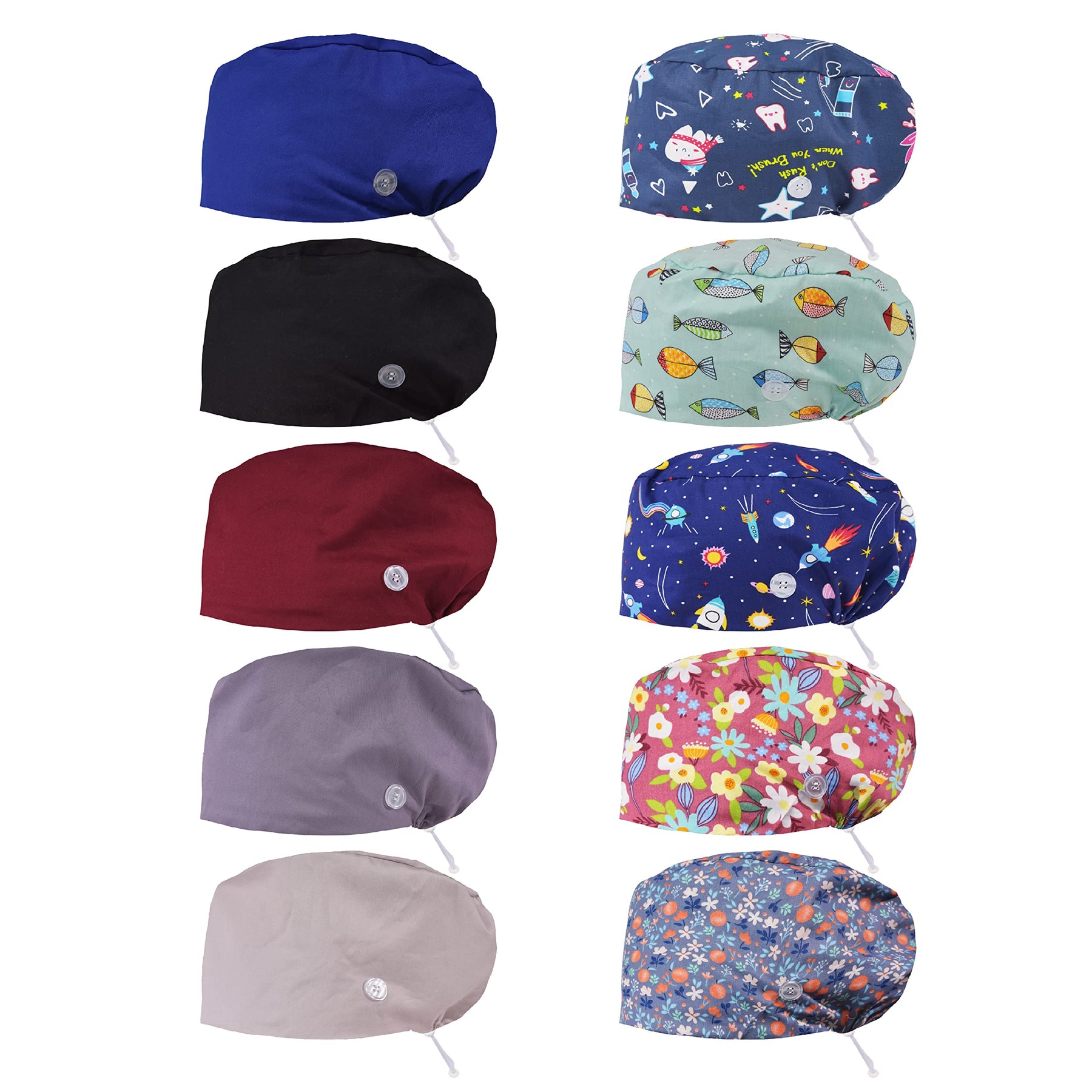- Original Scrub Sets – 10 Pieces Working Hat with Buttons and Sweatband, Adjustable Bouffant Scrub Caps Women Men Nursing Caps for Nurses (10:5 Printed+5 Solid) by AIFHAAN