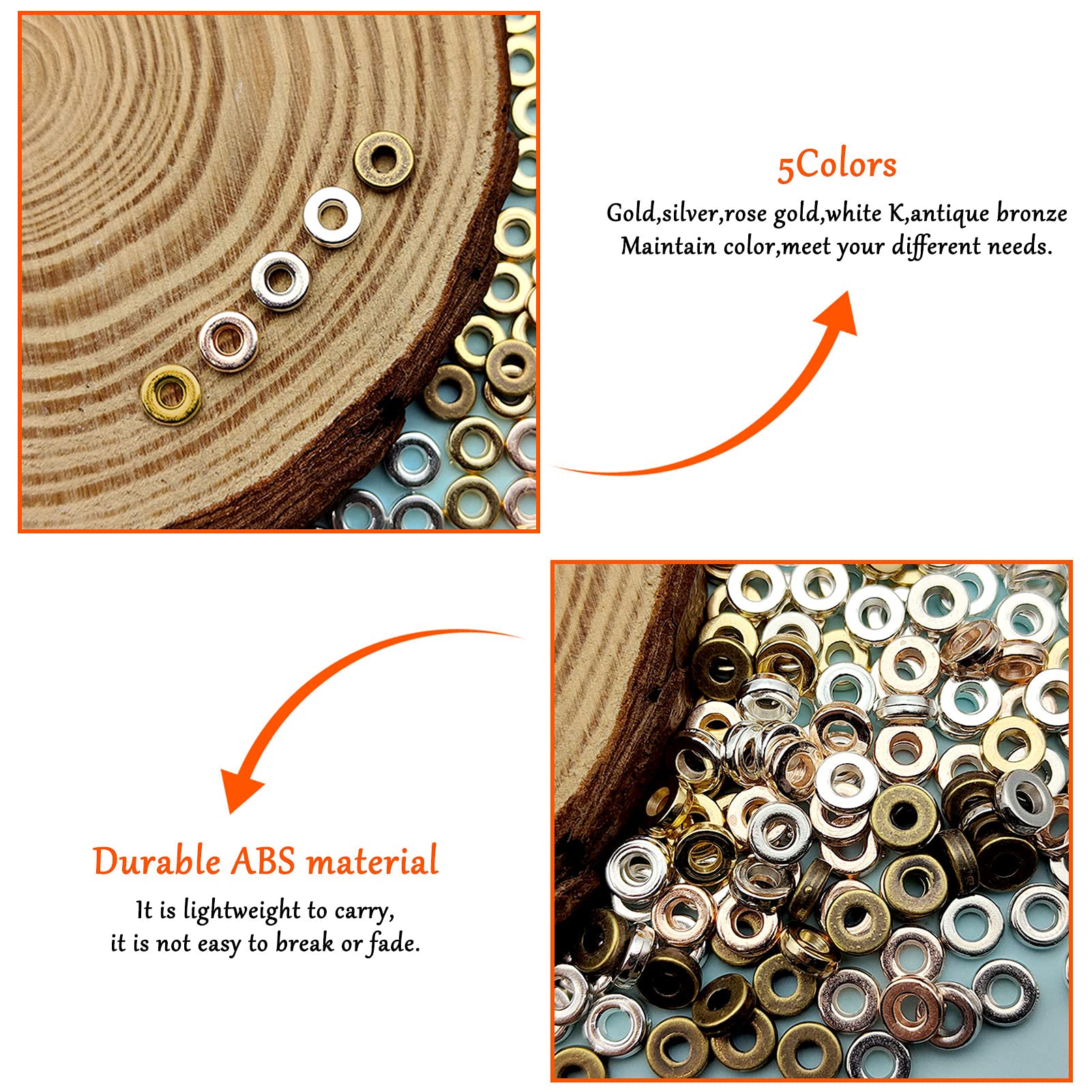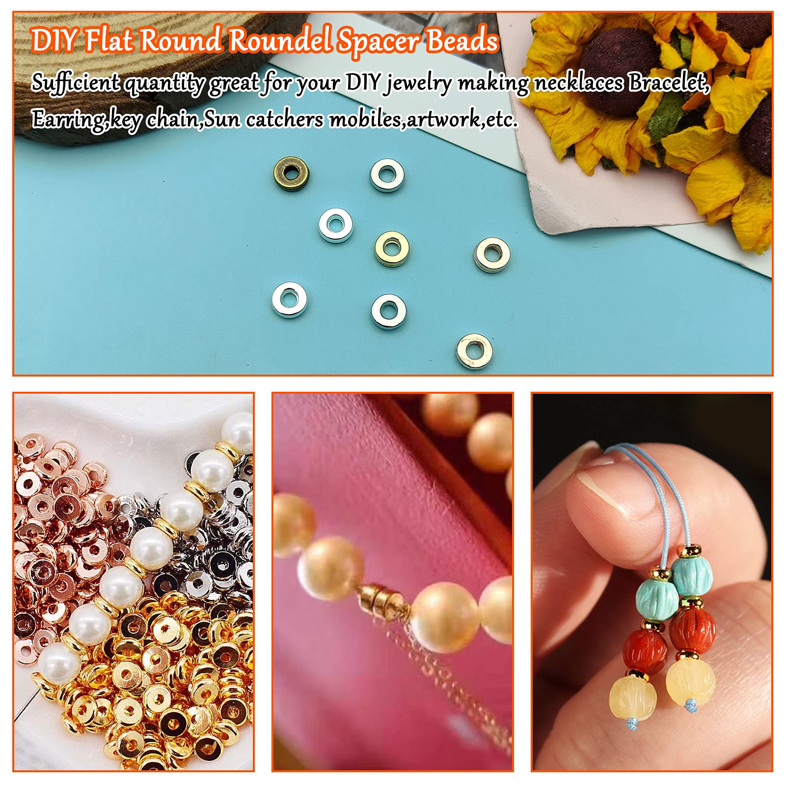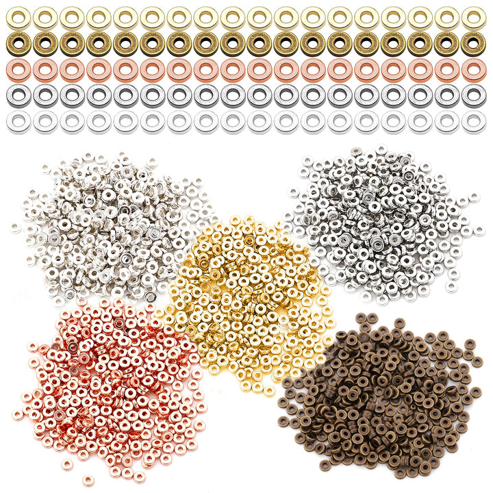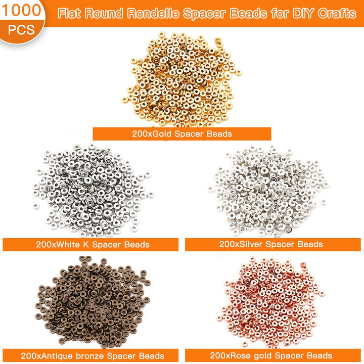 - Package Includes:Comes with 1000Pcs Flat Round Rondelle Spacer Beads in five colors,they are gold,silver,rose gold,white K,antique bronze,200Pcs in each color,sufficient quantity great for your DIY jewelry making necklaces Bracelet,Earring,key chain,Sun catchers mobiles, artwork,etc.