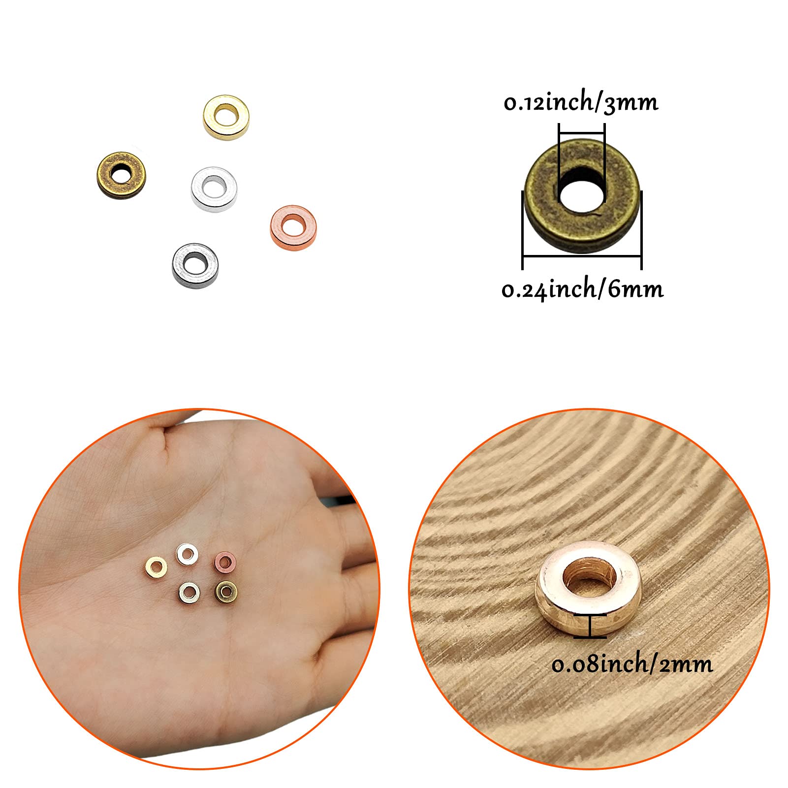- Size&Color:The rondelle spacer beads come in five color,they are gold,silver,rose gold,white K,antique bronze,mainstream colors,The outer diameter of the Spacer bead is 6 mm,and the inner diameter is 3 mm, the thickness is 2 mm.