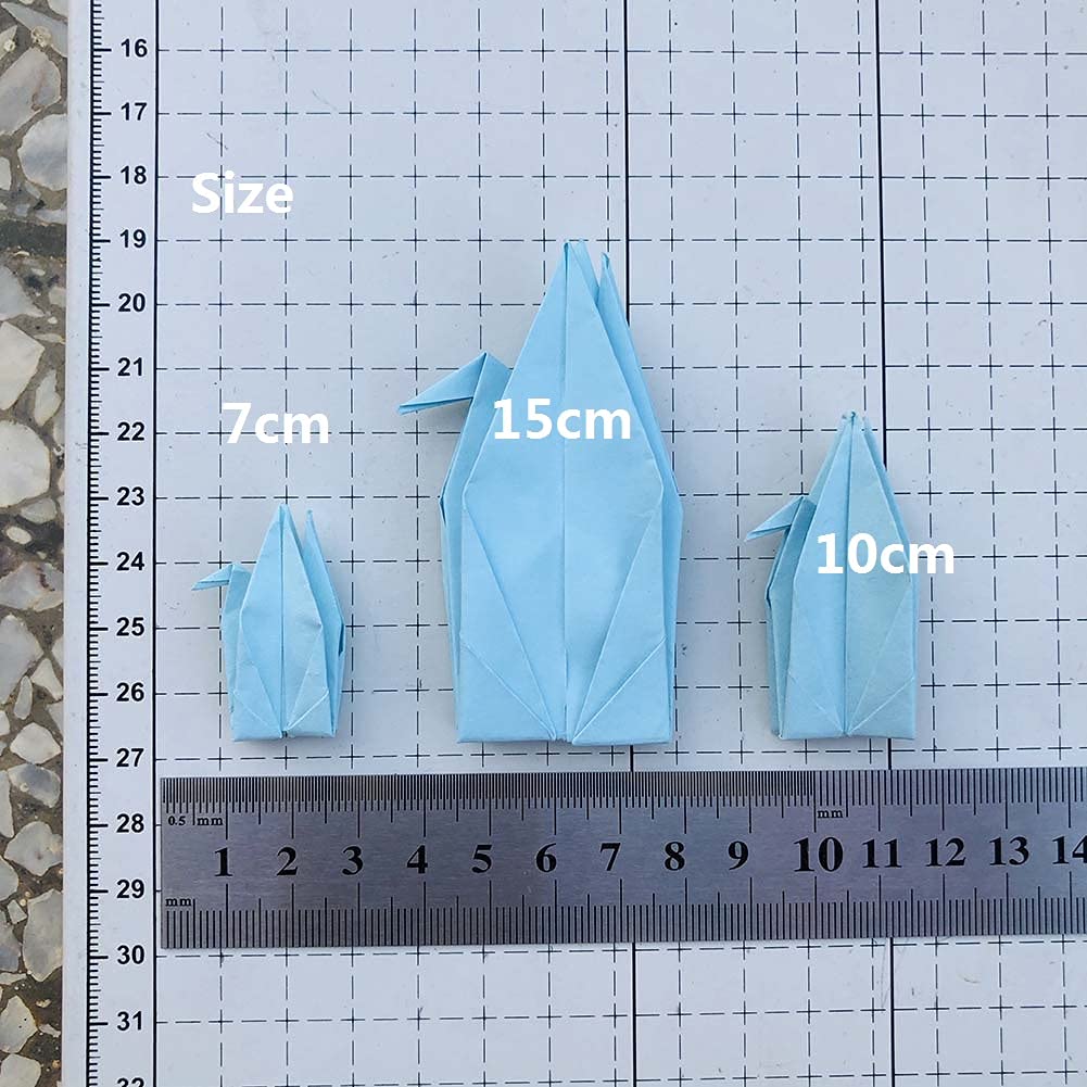 - Origami Birds Party Decorations: This crane made by 3.94 square paper, after fold the size is 3.94x1.97 (pull out the wings), see the photo in our page which clearly notes the size. We packed these cranes in flat for good transportation. Please pull slightly both side for a beautiful wider effect. Great for wedding party favor.