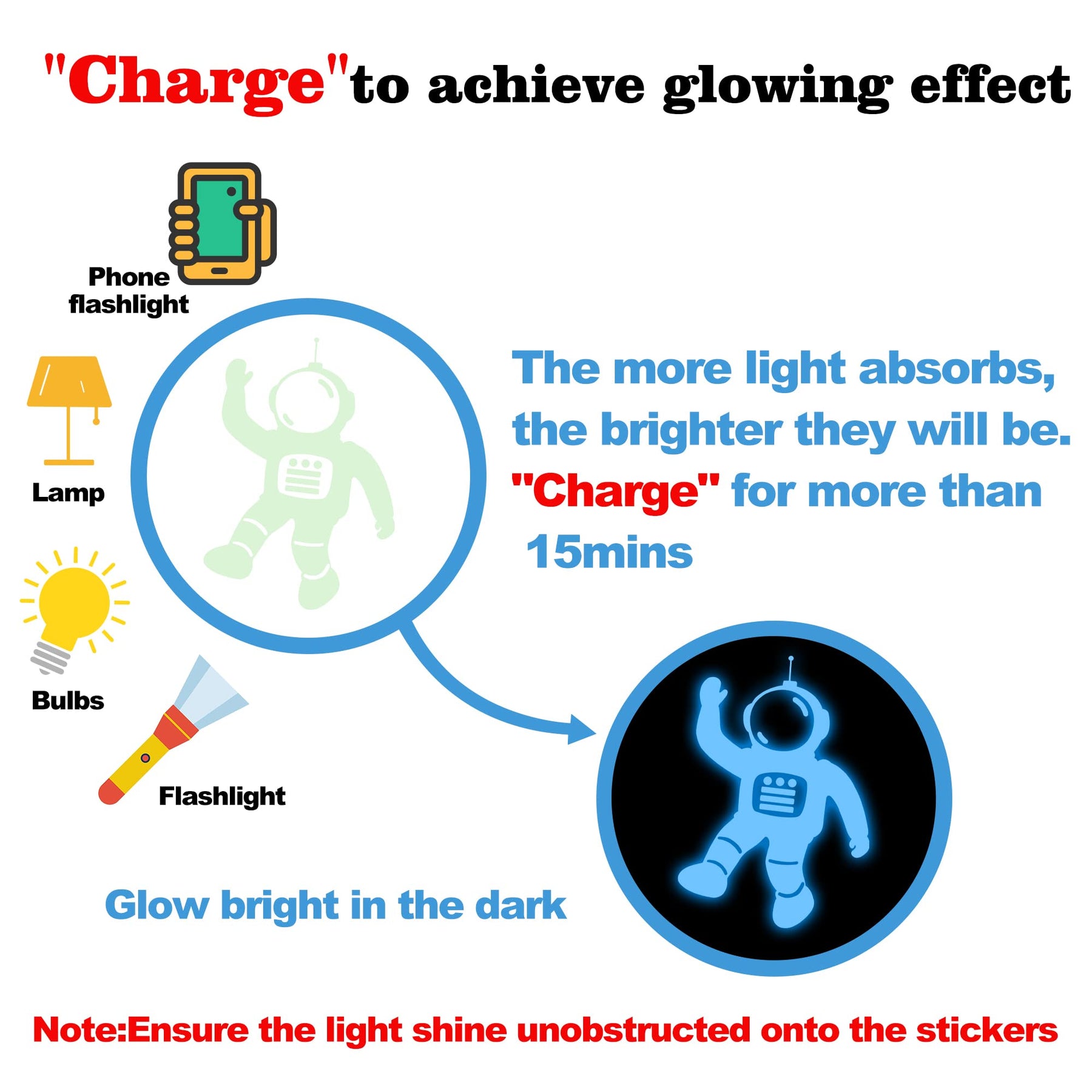 - Glow Brighter and Longer:Our moon and star decals are beautiful,very realistic and glow like crazy,they glow brighter and longer than the typical glow in the dark stickers,the brightness depends on the light it absorbs.you just need to put them under sunlight,room light or flashlight for 15 mins.Note:Please ensure the light shines unobstructed onto the moon.If you stick our stars for ceiling,please charge them with flashlight or room light before night.