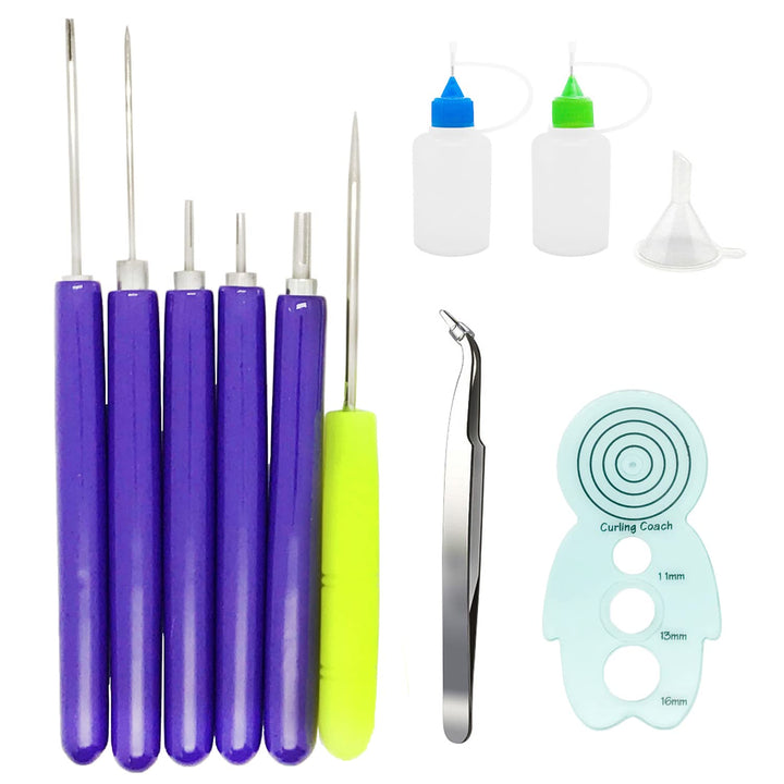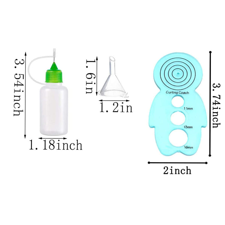 - You will get: 2 needle bottles, 1 small funnel, 1 curling coach, 5pcs Different Size Quilling Slotted Tools, an awl Random Color and a small tweezer, 11 pieces in total.