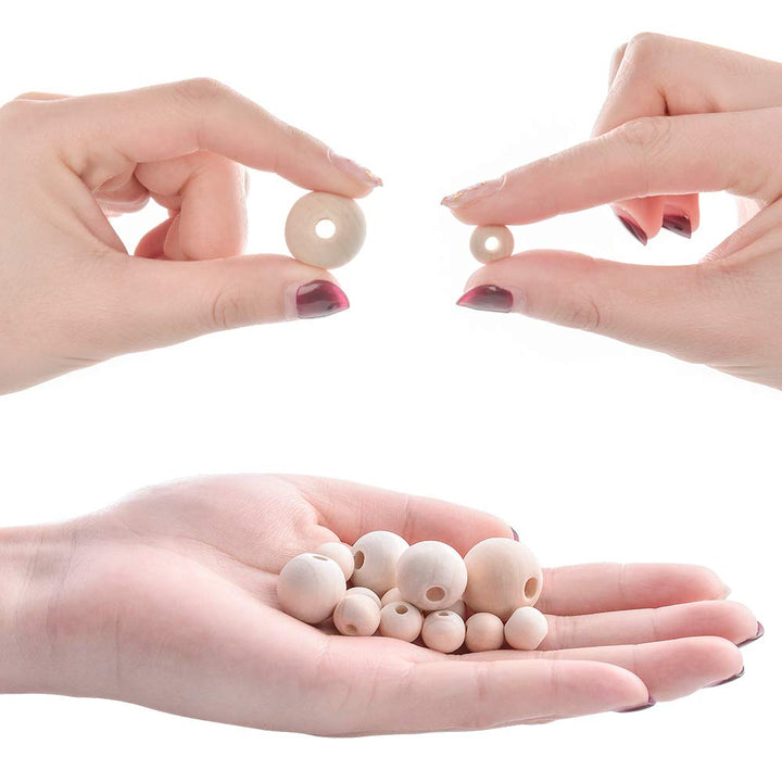 - Assorted Size: Litthing round wood beads include 6 different size. The diameters are 6mm (hole 2mm/600pcs), 8mm (hole 3mm/260pcs), 10mm (hole 3mm/130pcs), 12mm (hole 3mm/70pcs), 16mm (hole 3.6mm/30pcs), 20mm (hole 5mm/15pcs), 1105 pieces total