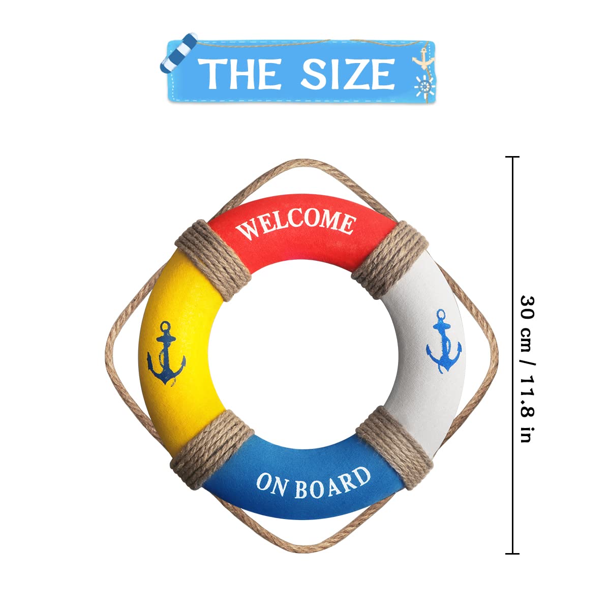 - Various Colors- This decorative life ring consists of red, blue, yellow and white.The life ring decor is printed with WELCOME and ON ABOARD. They are really delicate nautical decor. Show the nautical atmosphere.