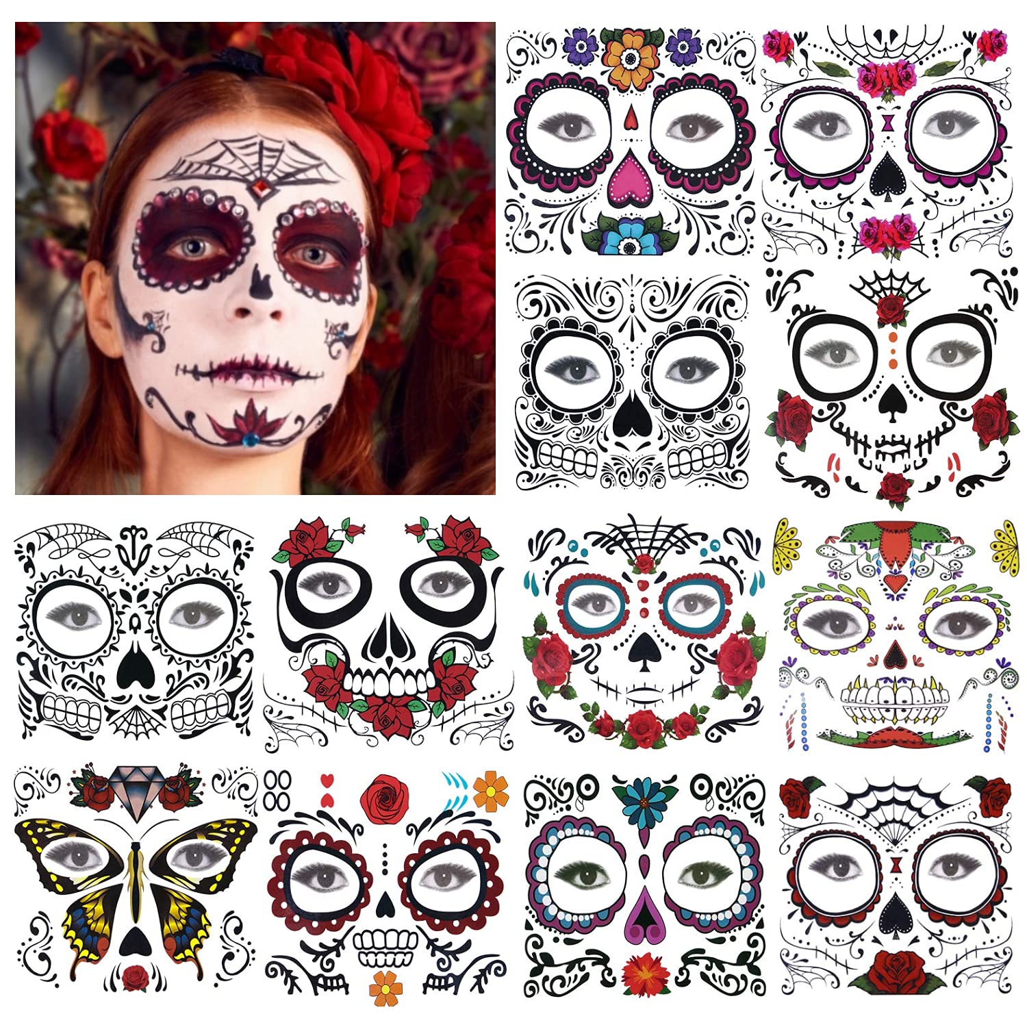 - Original Temporary Tattoos – 12 Pack Day of the Dead Sugar Skull Temporary Face Tattoo Halloween Makeup Tattoo for Men and Women by AFSTEE