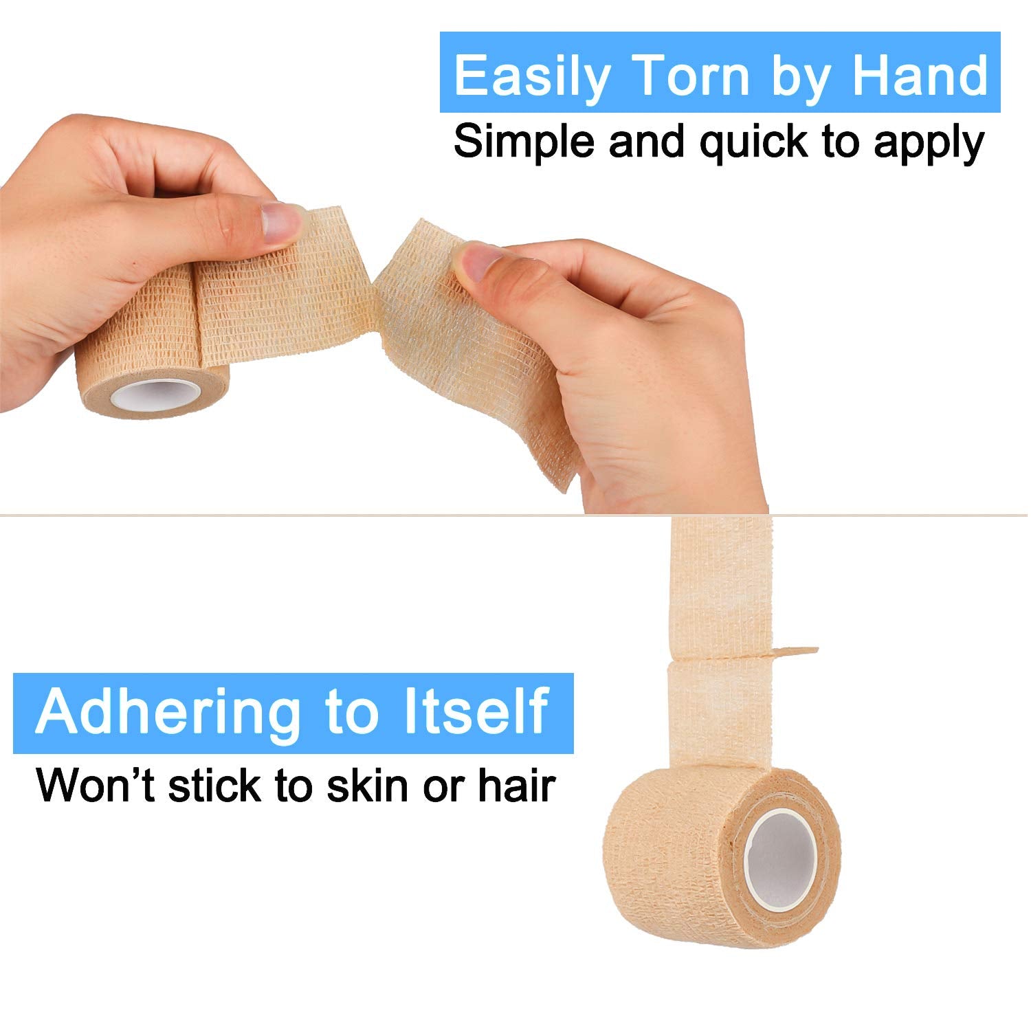 - Flexible Self Adhesive Bandages with High Precision Material - Bandage is made of high quality porous fabric and non-woven material. It's completely safe for skin because it can provide good ventilation. Durable elastic material allows the bandage to be applied quickly and easily to almost any body part.Cohesive bandage wraps are easy to tear by hand without scissors or scissors. Simply tear and wrap wrists, fingers, ankles, back, knees, feet and other body parts with your hands; also for pets.