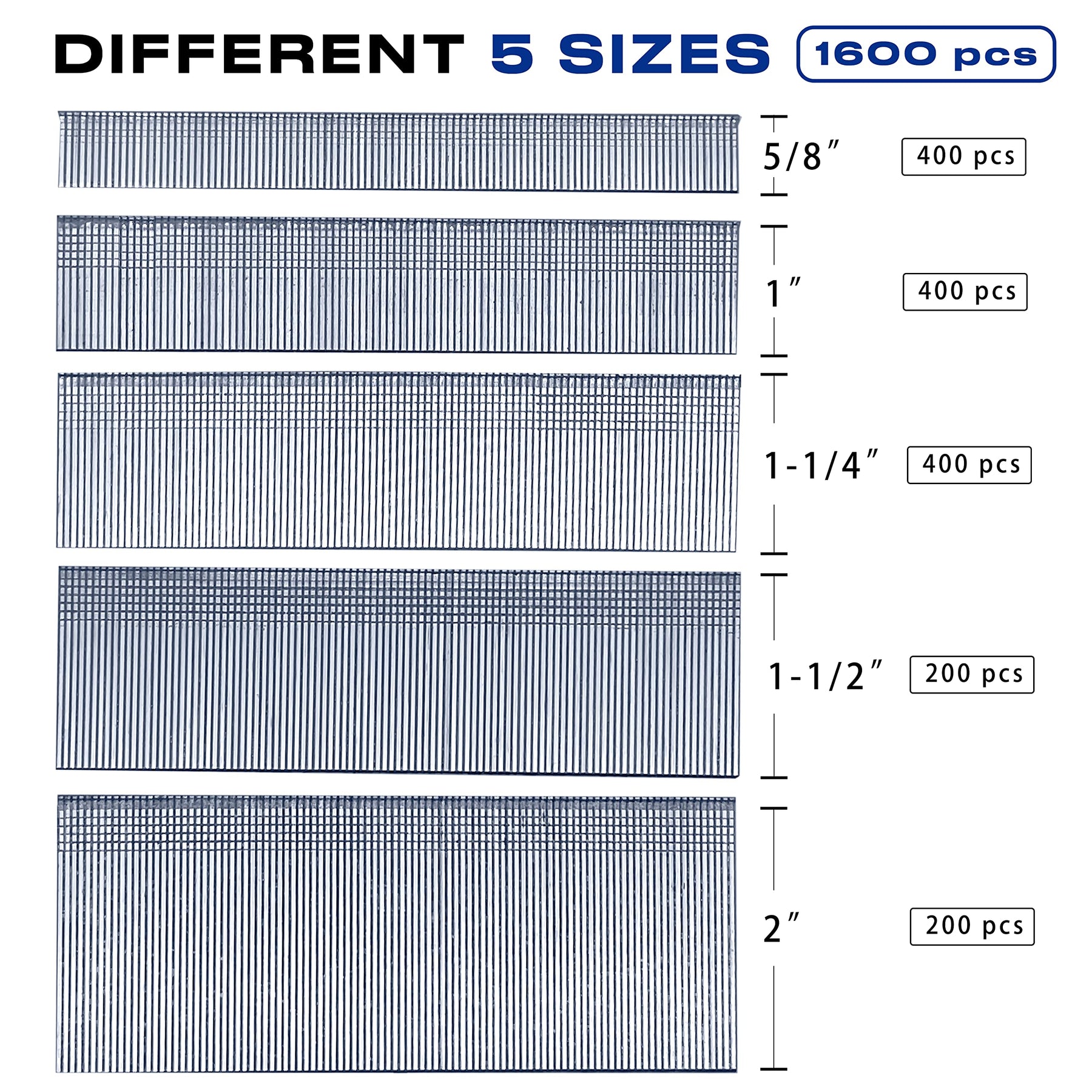 - Different Quantity and cost savingThe sizes(5/8, 1, 1-1/4) of all sizes are the most commonly used sizes and so we put the 400 pcs each of them, sometimes you also need 1-1/2 and 2 nails for someplaces, and so we prepare 200 pcs each of them, the total 1600 pcs cost-competitive brad nails 18 gauge.