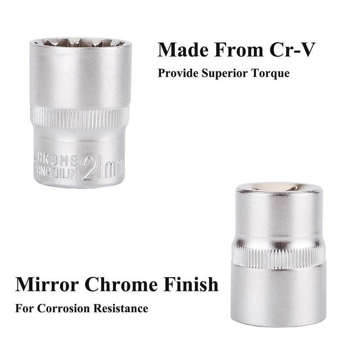 - HEAVY-DUTY AND DURABLEThe 1/2 socket set made from high strength chrome vanadium steel, provide superior torque for greater turning power with mirror chrome finish for corrosion resistance.