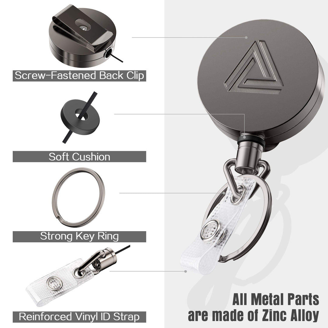 - [DURABLE RETRACTABLE BADGE HOLDER] - The heavy-duty badge reel is encased in a metallic color casing made of military grade zinc alloy metal. This strong casing provides support and protection to increase the longevity (over 100,000 pulls).