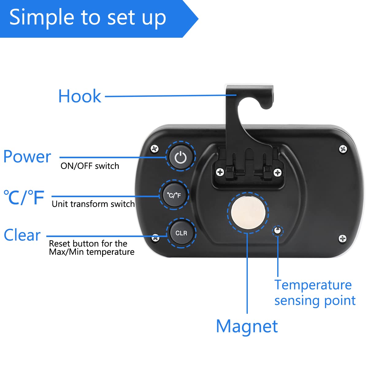 - Hook, Magnet, Stand: Temperature sensing point is on the back. Hanging inside the refrigerator, the measuring temperature is more accurate.