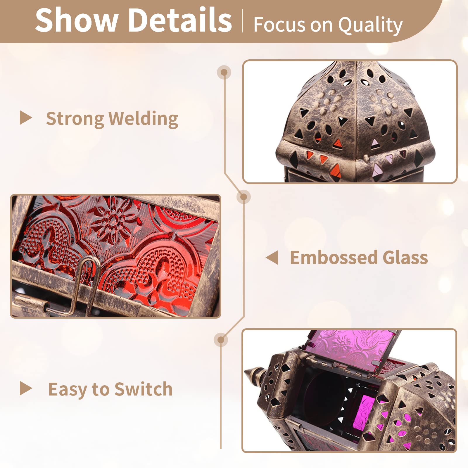 - VINTAGE DESIGN: Moroccan style candle holders, perfect bronze iron, at the top and bottom of the hollow out pattern, six sides, red and purple glass. Everything is simple but unique works of art