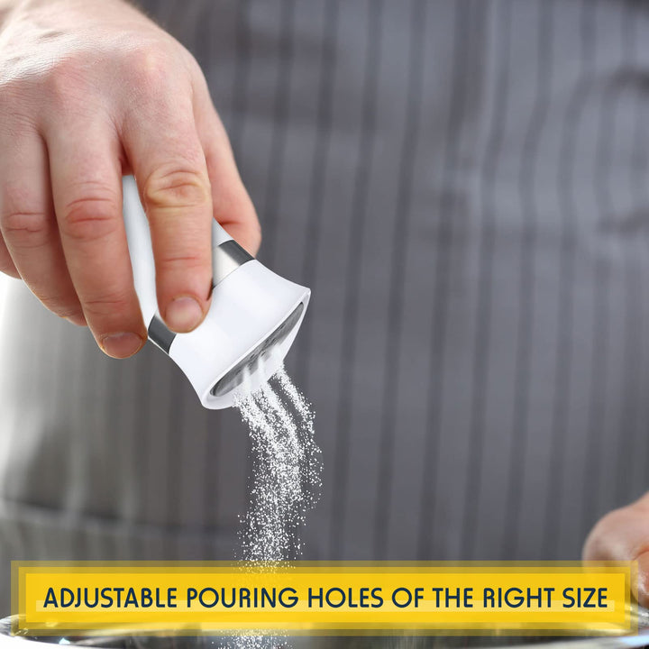- Easy to use: equipped with adjustable pour holes that are the just the right size on the lid, the refillable shaker ensures salt and pepper end up only on your food, prevent spilling over the table, allows you to easily control the amount of salt and pepper added to your meal