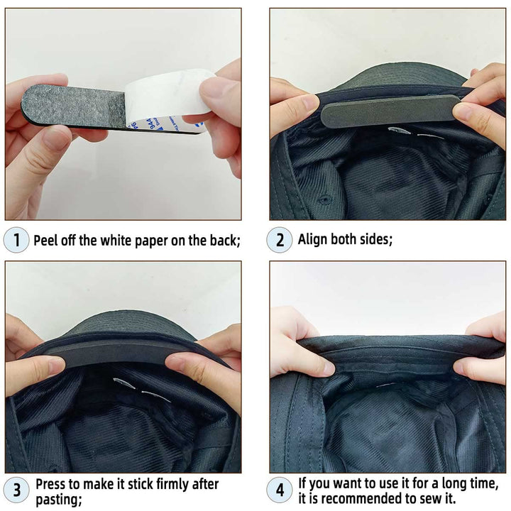 - Easy to UseThis hat size reducer is very easy to use. Just peel off the white paper on the back, and then attach this self-adhesive tape to the inside of the hat, it will stick firmly to your hat. Of course, this self-adhesive tape can also be cut, you can cut this hat size reducer to suitable size according to your needs
