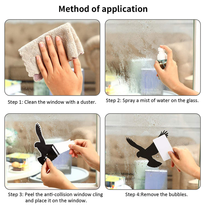 - Easy to operate: first, clean the window with a duster; Second, spray a mist of water on the glass; Third, peel the anti-collision window cling from the vinyl backing and place it on the window in any design you like; Finally, remove the bubbles