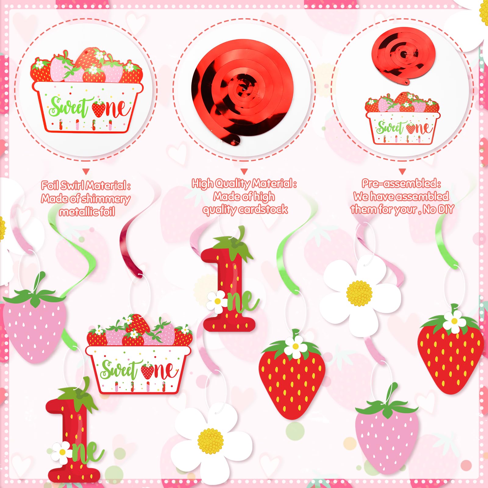 - Strawberry Party Hanging DecorationsPackage contents 20pcs hanging swirls,5 kinds of strawberry design cutout hanging swirls;4* strawberry sweet one cut-out;4* red strawberry cut-out;4* white flower cut-out;4* strawberry one cut- out;4* pink strawberry cut-out,Its charming designs and colors will definitely light up your toddle's birthday.
