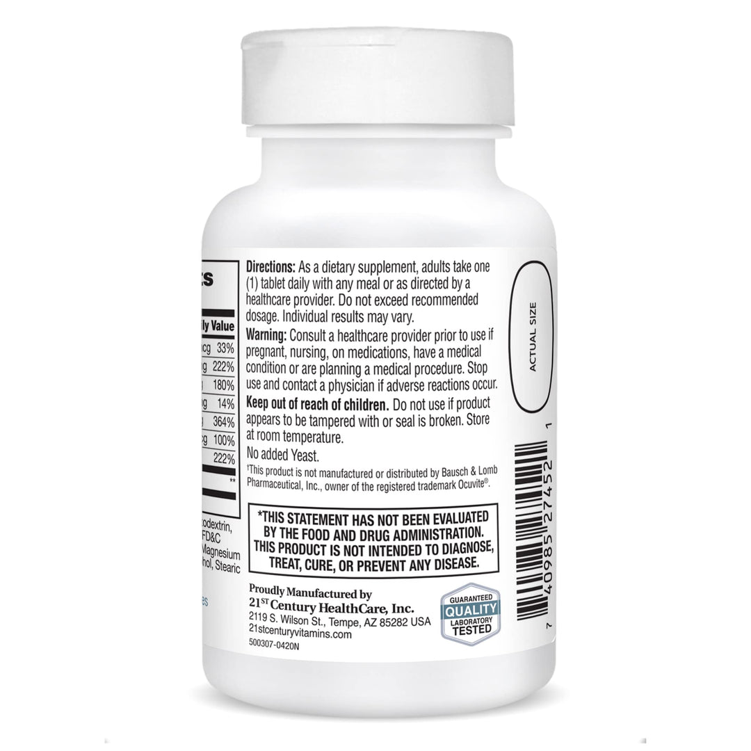 | ingredients | Vitamin A, Vitamin C, Vitamin E, Zinc, Selenium, Copper, Lutein. Other Ingredients: Calcium Carbonate, Cellulose, Starch, Silicon Dioxide, Stearic Acid, Croscarmellose Sodium, Titanium Dioxide, Magnesium Stearate, Artificial Color added (FD&C Yellow #6). |