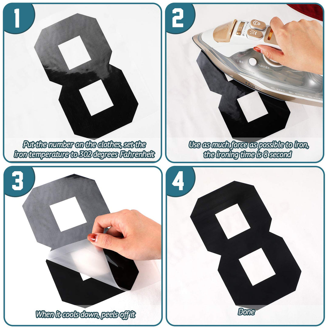 - Our products have black numbers on the front with transparent PET film, and glue on the back; Lay the clothes horizontally, with the plastic surface close to the clothes; After placing it correctly, wait for the temperature of the heat press to reach 301 degrees Fahrenheit, and then iron the white front side with the PET film with an iron as much as possible for about 8 seconds to ensure that it is firm, and then tear off the transparent PET film after it is completely cooled