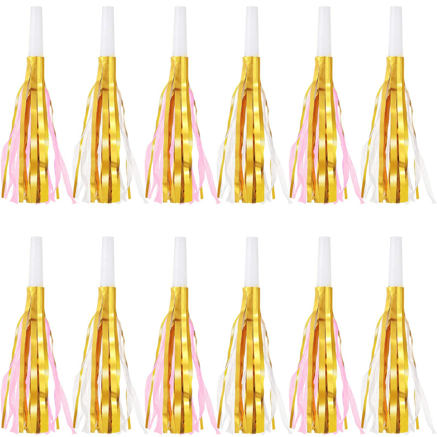 - You will get: comes with 24 pieces of glitter metallic fringed noise makers, including 12 x pink and gold fringed party blowers, 12 x white and gold fringed party blowers, adequate quantity and bright colors for you to decorate an active and happy party
