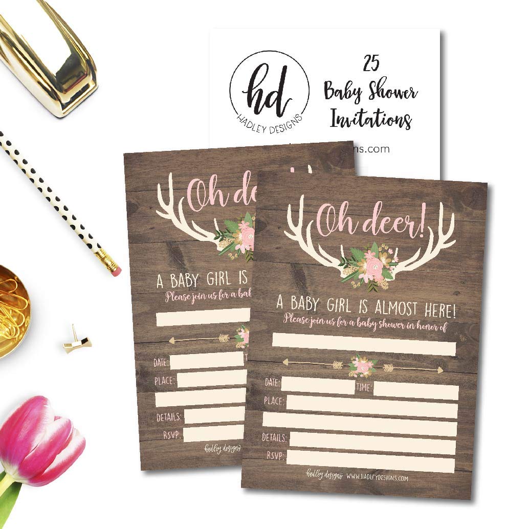 - Original Invitations – 25 Oh Deer Baby Shower Invitations, Pink Rustic Sprinkle Invite for Girl, Buck Modern Gender Theme Almost Here, Woodland Hunting Cute Printed Fill or Write in Blank Printable Card Party Paper Supplie by Hadley Designs