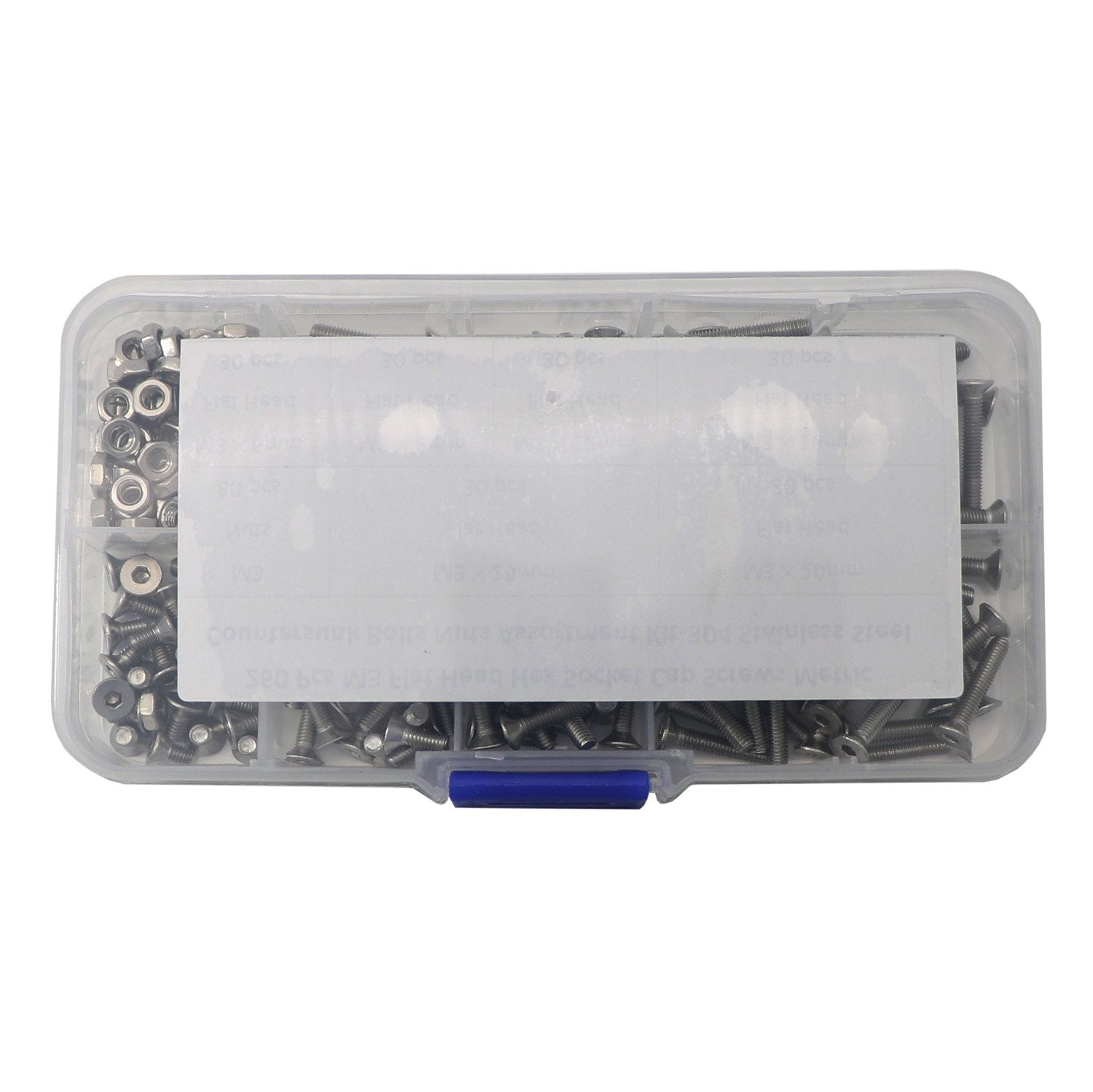 Package Quantity: 260Pcs m3 Hex Socket Bolt and Nuts. This stainless steel bolts and nuts kit is organized by size in a transparent storage case for quick access and protection.