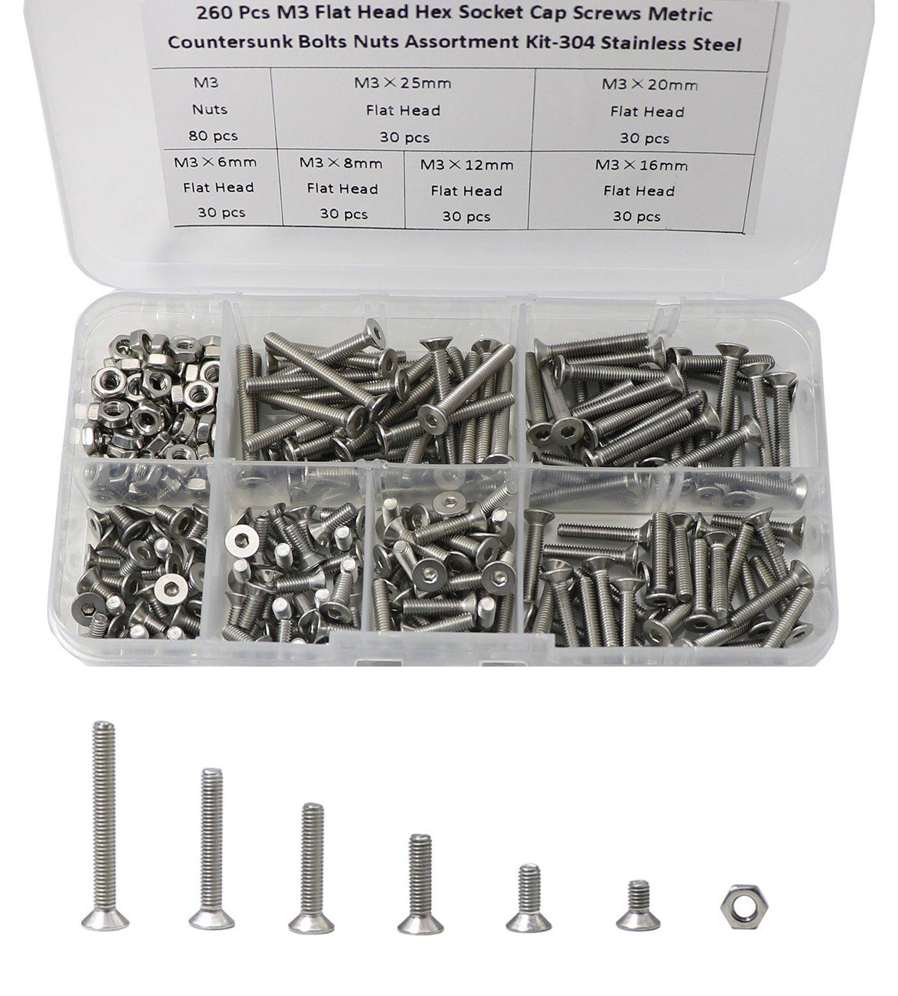 M3 Screw Assortment, 304 Stainless Steel Flat Head Countersunk Socket Cap Bolts Screws Nuts Assortment Kit