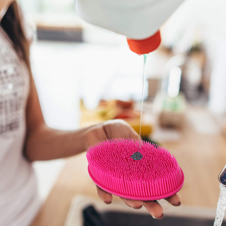 The silicone body brush is double sided, so you can use one side for a daily gentle scrub and the other for cellulite reduction. The long gentle bristles create the good lather, the soft side is especially great for sensitive skin, you can even use this brush for a body or scalp massage.
