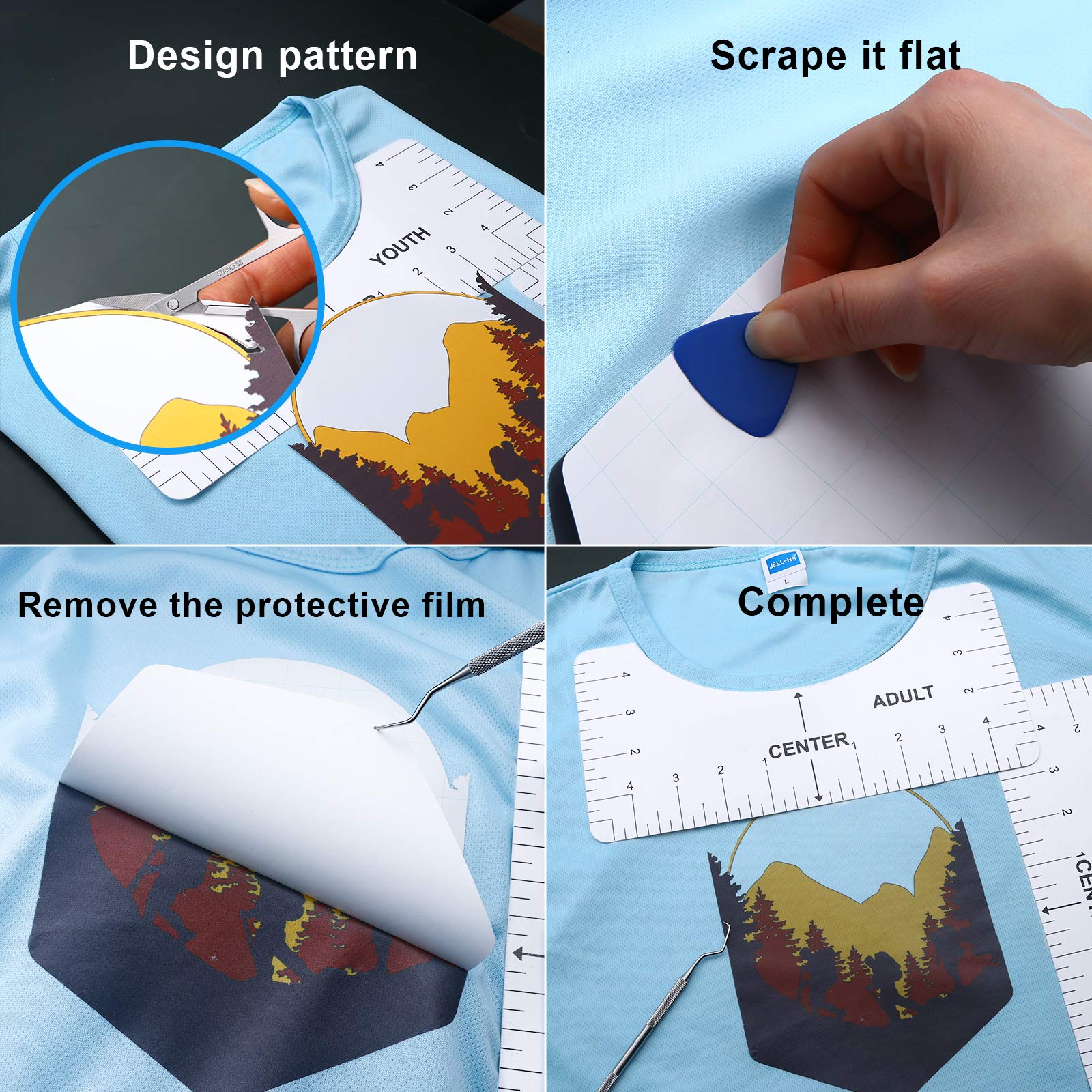 - VALUABLE PACKAGING:2 PCS tweezers, a triangular slice,2 PCS spatula, a tracing Pen, 3 PCS hook weeder, a stainless steel scissors, an awl, 3 PCS scraper, 4 PCS T-Shirt alignment rules, 10 PCS blades, a carving knife, a cutting board.