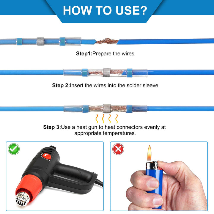 - Simple operation: you can just put 2 stripped wires into the solder sleeve and heat it with a hot air gun, and the insulating tube will shrink with a shrinkage ratio of 2:1 to form a waterproof seal, so as to complete the connection