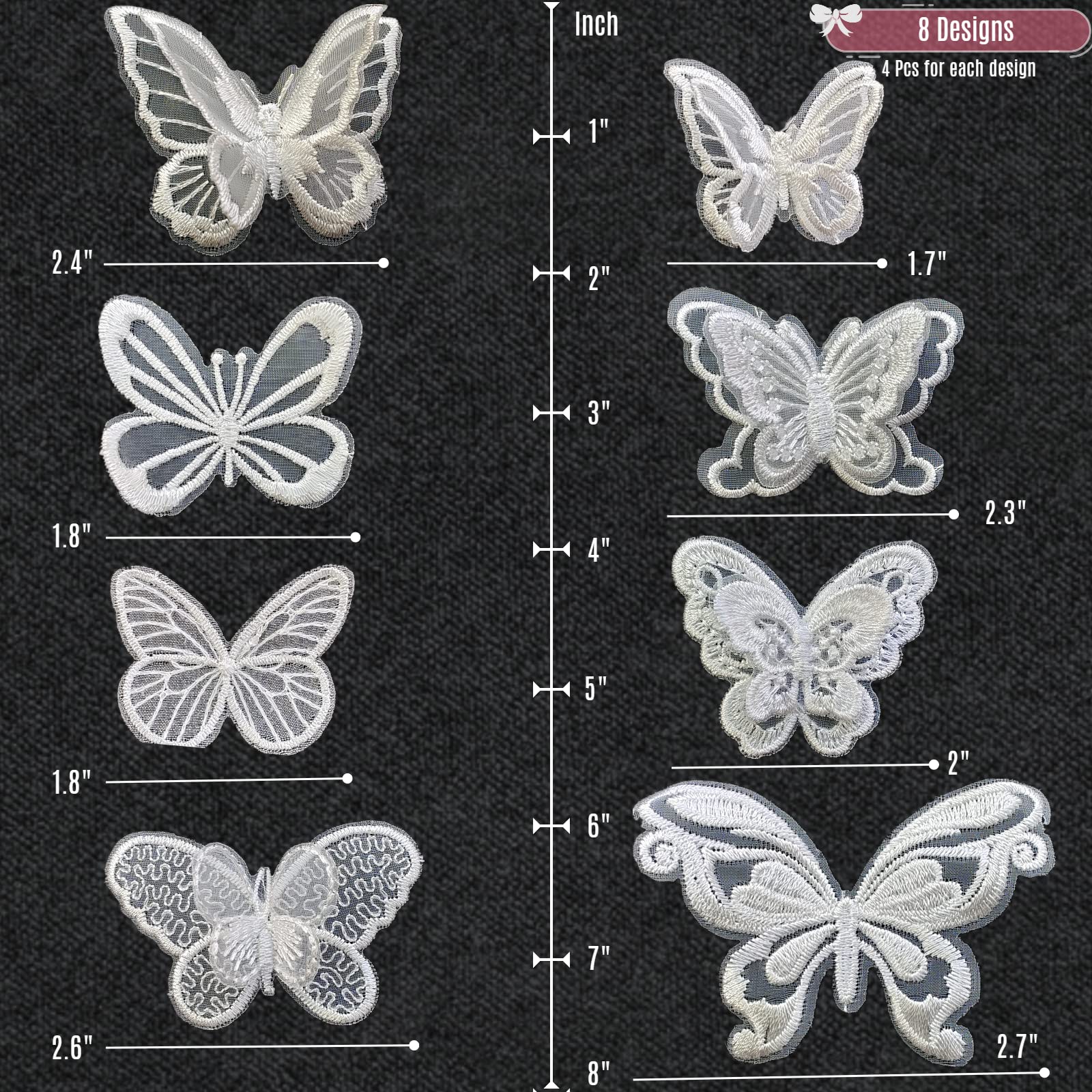 - Great value butterfly appliques Set:you will receive 8 different style lace butterfly applique, 8 pieces for each style,32 pieces in total.Enough quantity and optional sizes for wearing.using your imagination to make any DIY craft projects .