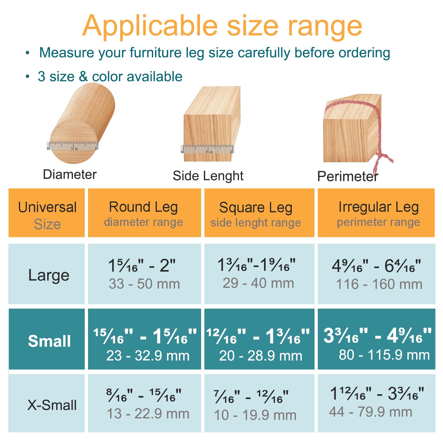 - Common size Suitable for chair foot with perimeter of 3-3/16 to 4-9/16 (80-115.9mm). Round diameter of 15/16 to 1-5/16 (23-32.9mm). Square length 0f 12/16” to 1-3/16 (20-28.9mm).