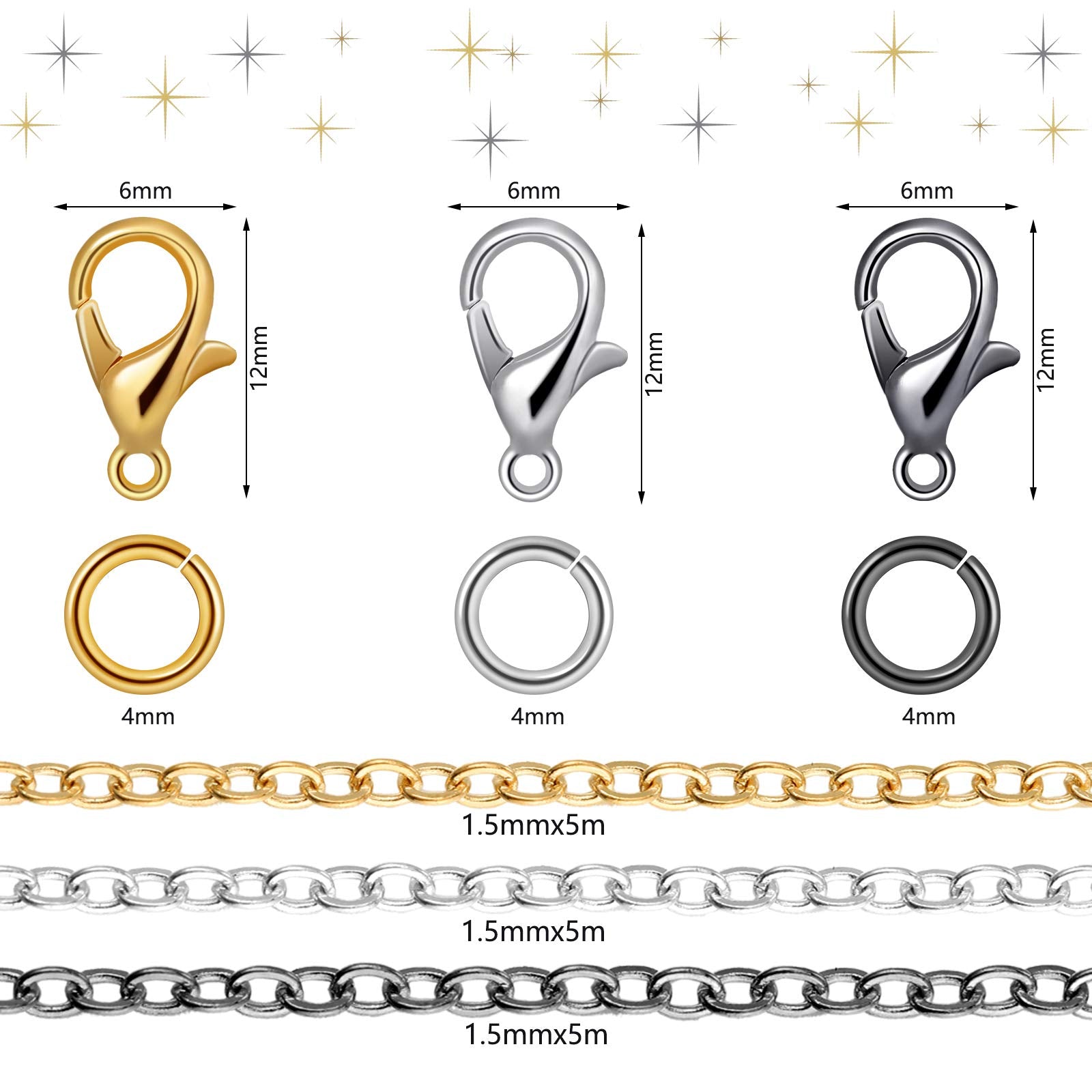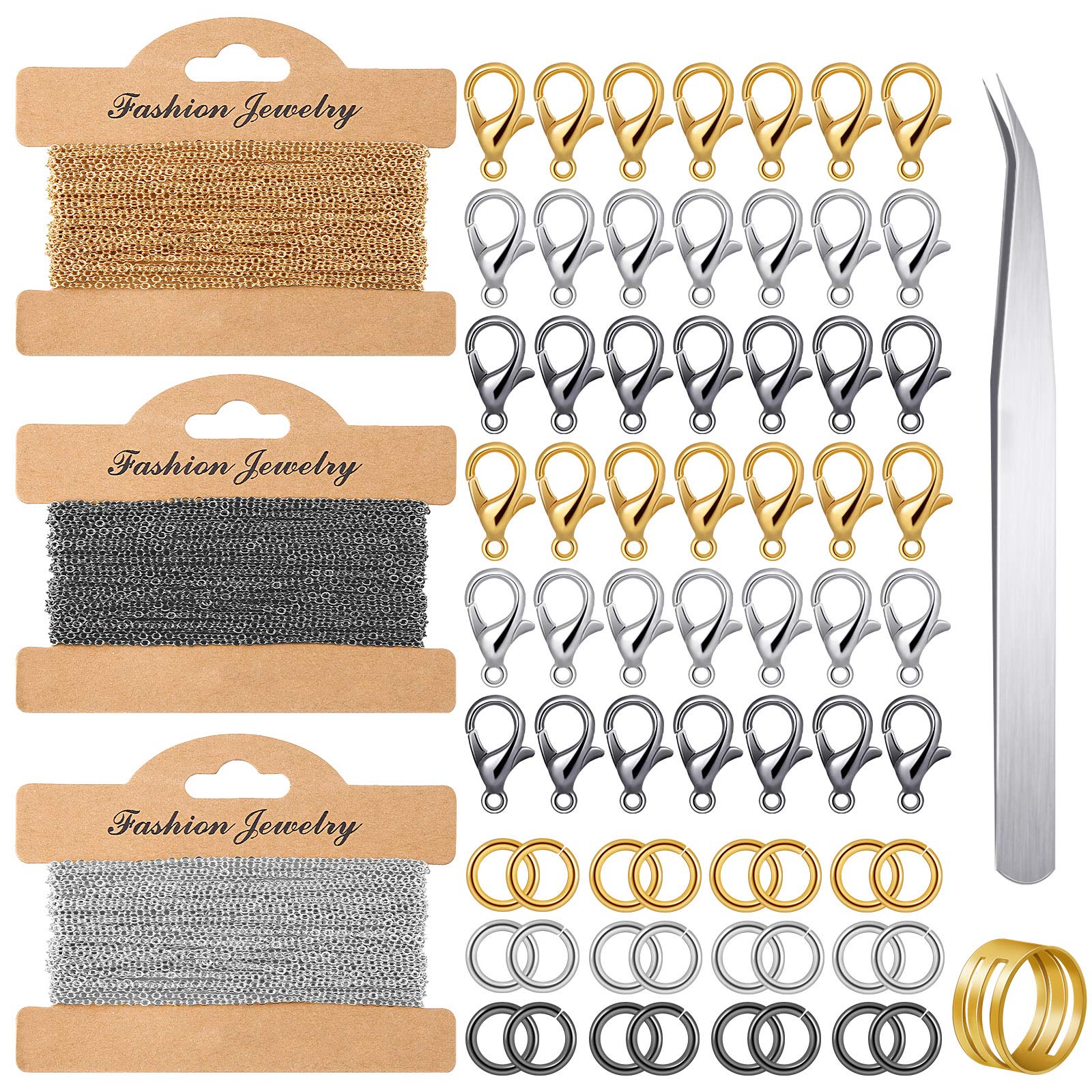 - Practical jewelry making set: the package comes with 3 pieces jewelry making chains in 3 colors (gold, silver and black), 50 feet/ 15 meters in total length, 300 pieces jump rings (silver, gold, black, 100 pieces of each), 60 pieces lobster clasps (silver, gold, black, 20 pieces of each), 1 x curved tweezers and 1 x jump ring opener, 365 pieces in total, help you to complete DIY jewelry making process easily