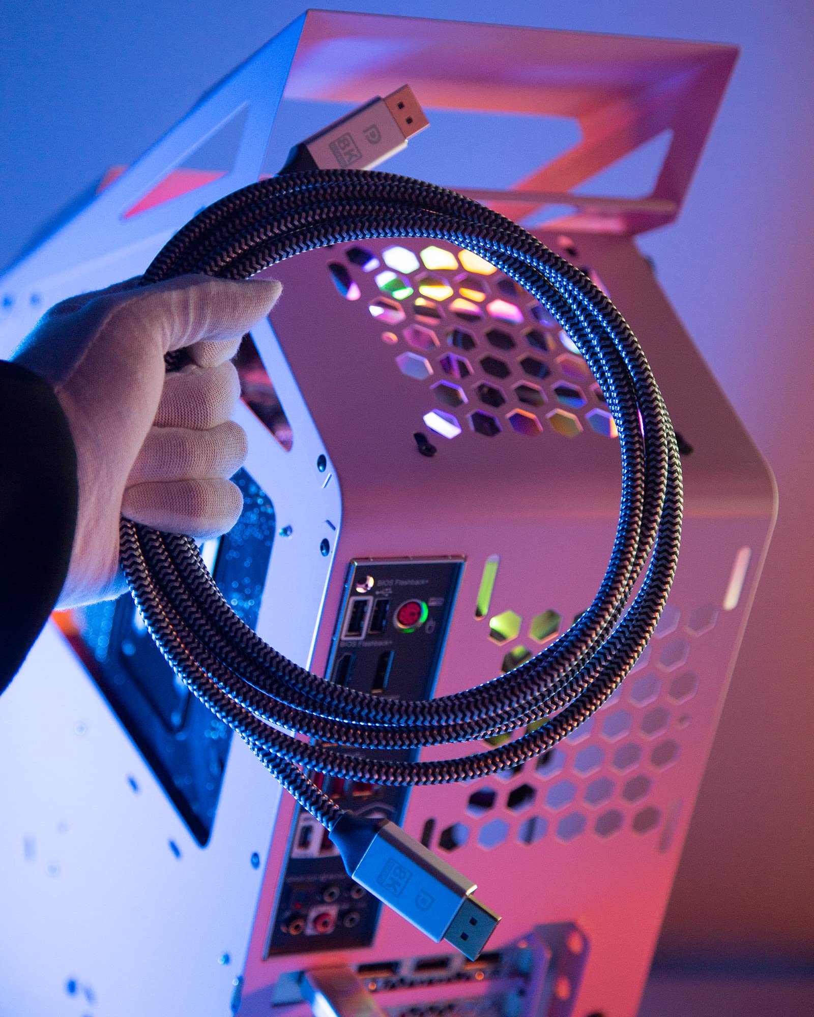 30AWG DisplayPort cable 1. 4 HBR3 cable can connect your DisplayPort supported (gaming) PC with an (Ultra) High resolution monitor or other DisplayPort supported device. DisplayPort 1. 4 adds support for display stream compression 1. 2 (DSC), forward error Correction, and extends the maximum number of inline audio channels to 32. DisplayPort connectors provide a secure and dependable connection. Nylon braided wire and alloy metal shell can protect the cable from bending and deformation.