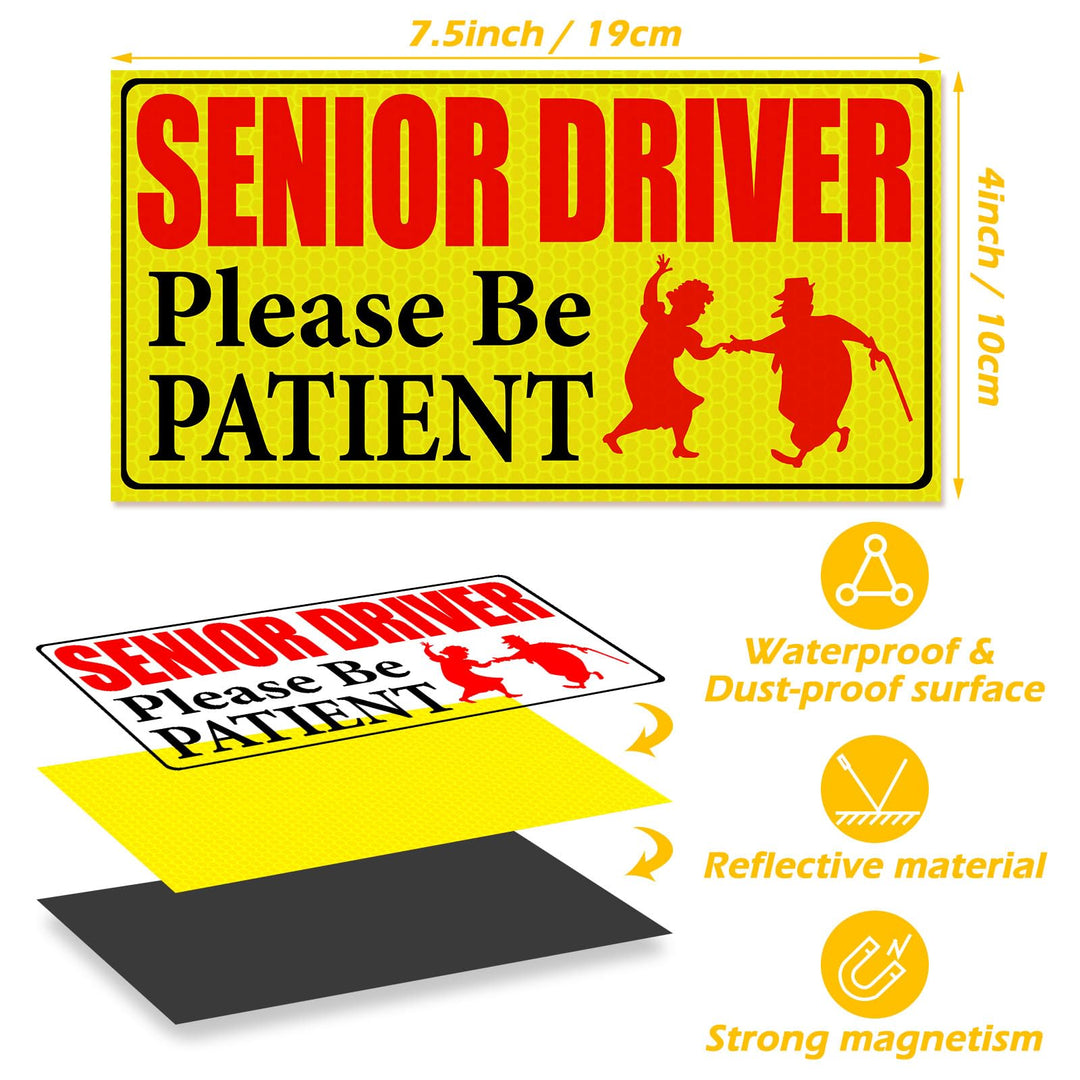 - What Will You Receive: this package contains four senior driver car magnets, measuring about 7.5 x 4 inches; Put these magnetic stickers around your car, and the reflection technology allows you to drive safely in weak light or night driving conditions