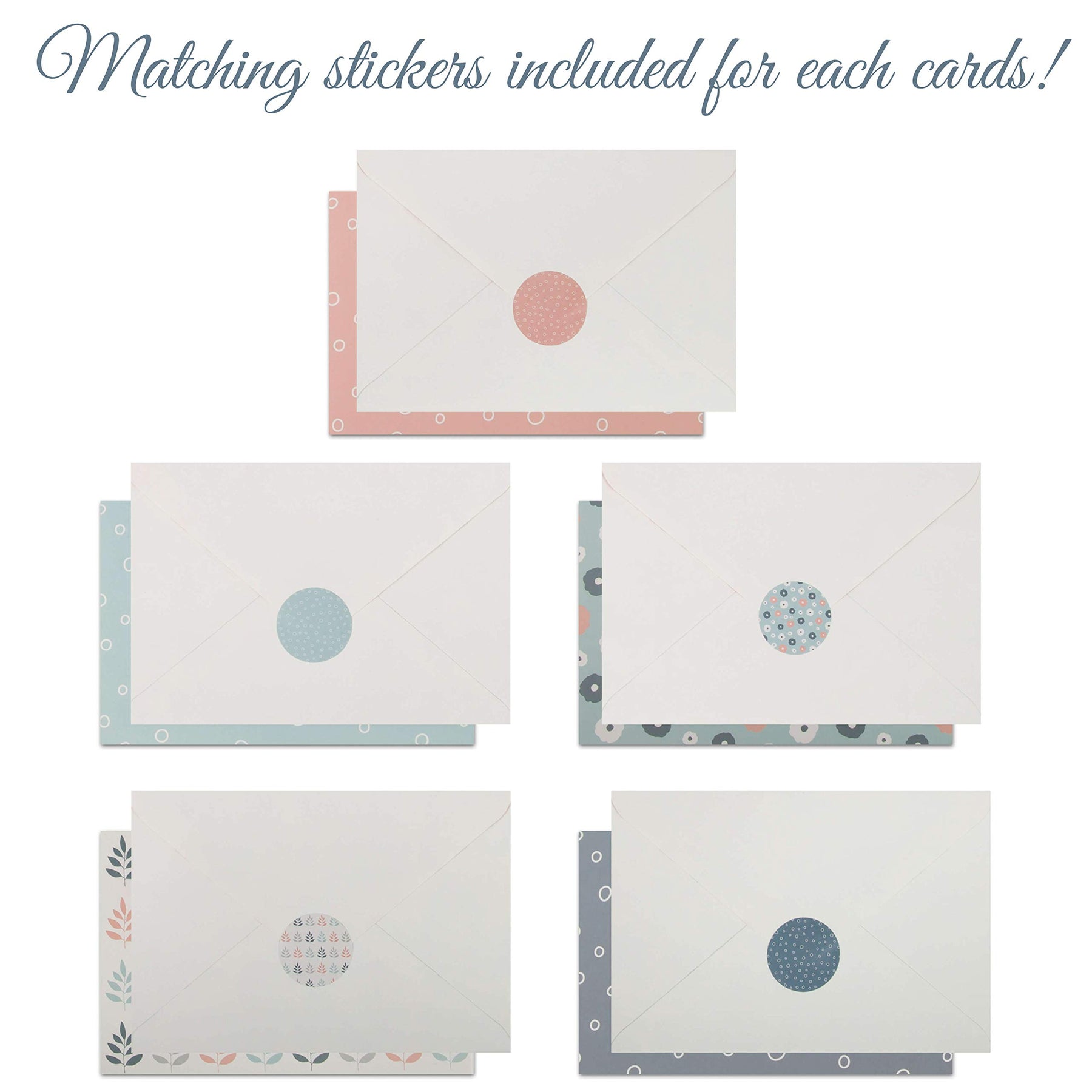 - VARIETY OF DESIGNS: The box set of 40 plain greeting cards contains 5 assorted and unique card designs in packs of 8 along with a variety pack of stickers to mix and match when sealing the envelopes! Each soft card includes an envelope and sticker to seal it. The versatility of these plain greeting cards means you can use them for a baby shower, bridal shower, engagement, baptism, christening, birthday, funeral, a recent grad, clients, employees, or any special occasion.