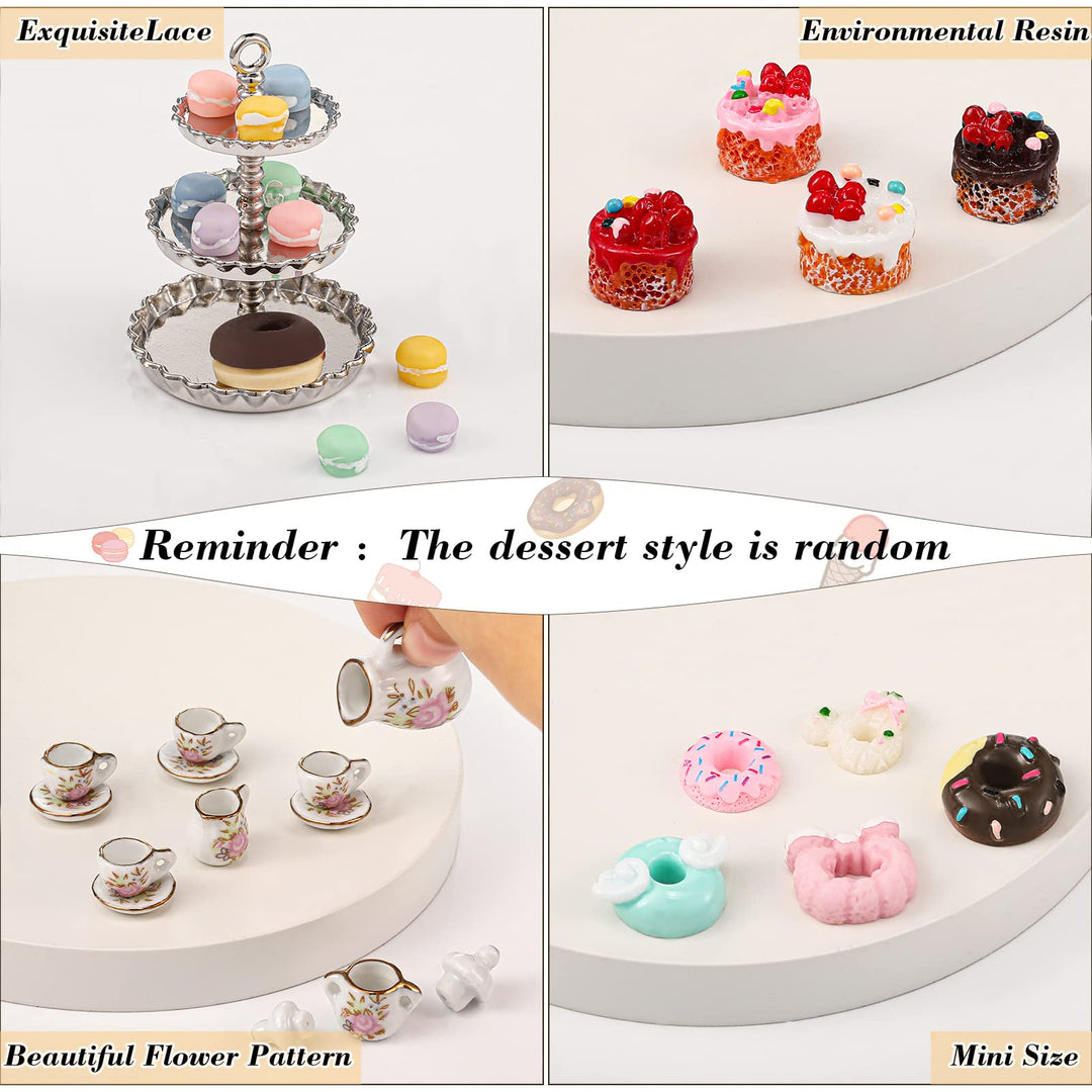 - Quality material: miniature charms dessert food kit and dollhouse jam strawberry cake are made of resin, smooth, safe, not easy to break, sturdy and stable; The mini flower pattern teapot cup plates set is made of ceramics, and the 3-tier cake stand is made of alloy, creating a transparent finish that is easy to store cakes and makes the cake stand more exquisite