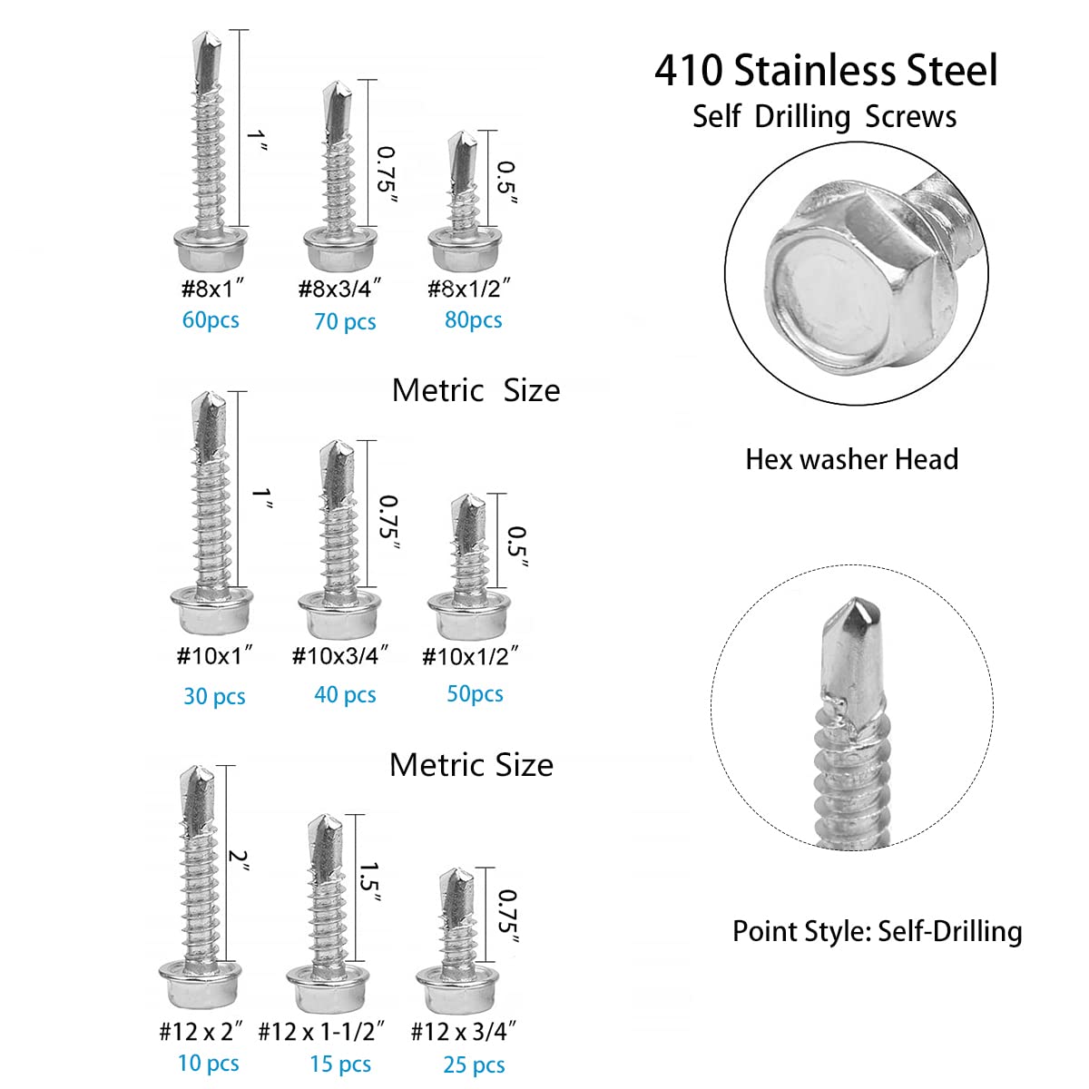 - Original Self-Tapping Screws – 410 Stainless Steel Self Tapping TEK Screws Assortment,380 pcs #8#10#12 Hex Head Self Drilling Screws for Metal,Length 1/2 to 2 by HVAKHVA