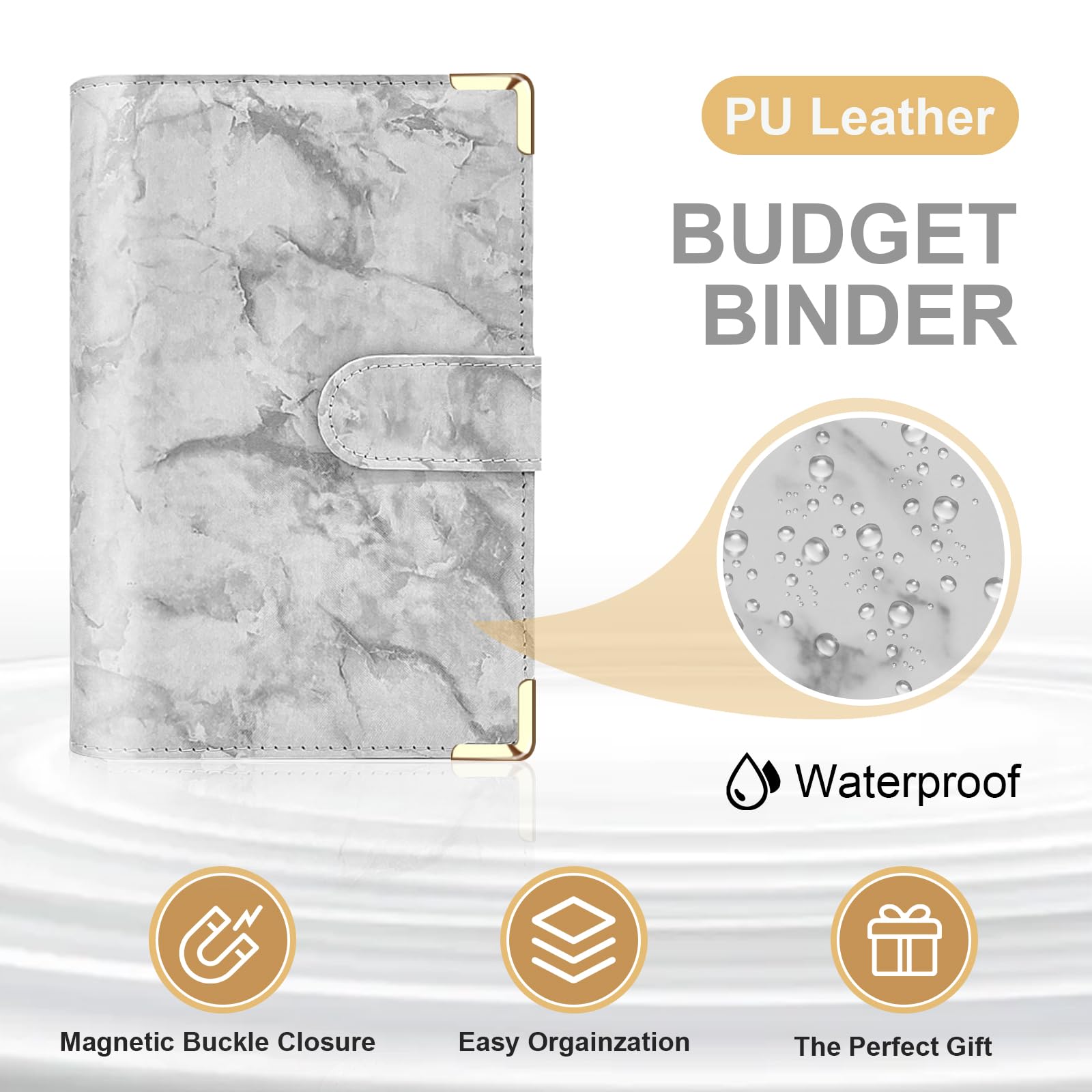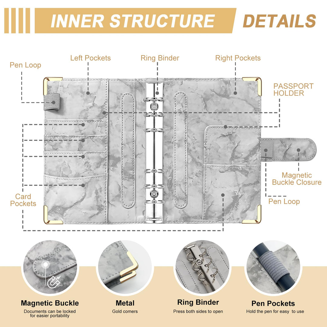 - Practial A6 Binder: The budget binder made of PU leather, which is soft to touch and has natural grain and luster. Several card sleeves & pen loops inside the front and back covers, easily store pen, ID card, VIP card, bankcard & passport. 6 stainless steel binder loops allow you to add or remove items flexibly, prevent them from falling off. The magnetic buckle can be tightly closed.