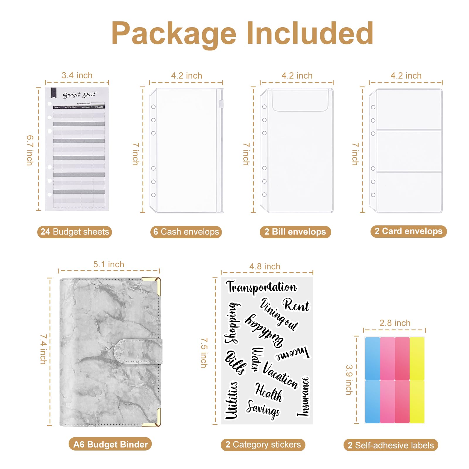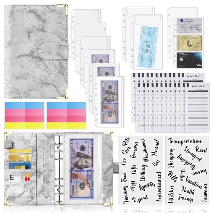 - All-In-One Budget Binder: This budget binder with cash envelopes all-in-one includes 1A6 budget binder, 6pcs cash envelopes ,2pcs bill envelops,2pcs card envelops,24pcs monthly planner budget sheets,2sheets of category stickers and 2 self-adhesive labels. This all-in-one budget binder is perfect for all ages to keep money organized! NOTE:THE PENS ARE NOT INCLUDED.