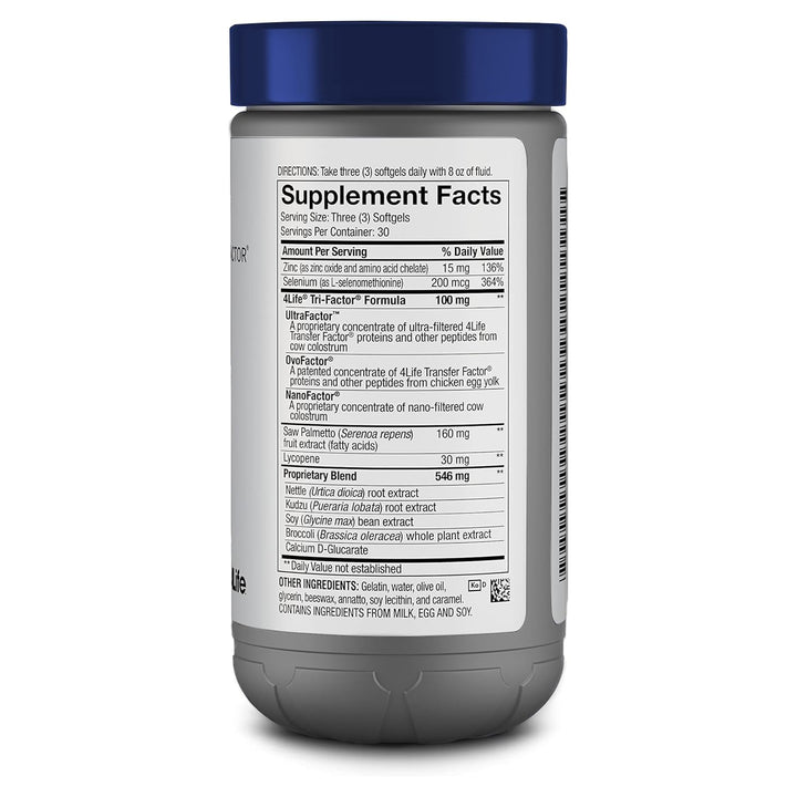 | ingredients | • UltraFactor XF®—A proprietary concentrate of ultra-filtered 4Life Transfer Factor® proteins and other peptides from cow colostrum • OvoFactor®—A patented concentrate of 4Life Transfer Factor® proteins and other peptides from chicken egg yolk • NanoFactor®—A proprietary concentrate of nano-filtered cow colostrum • Saw palmetto (Serenoa repens), lycopene, and kudzu (Pueraria lobata) root extract |