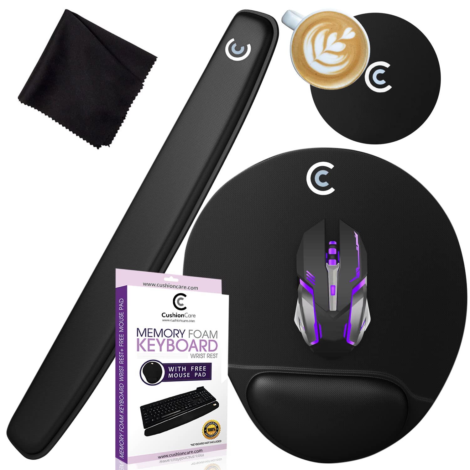 - 4PC CUSHIONCARE ERGONOMIC KEYBOARD WRIST REST PADS FOR COMPUTER KEYBOARD & CARPAL TUNNEL MOUSE PAD WITH WRIST SUPPORT + FREE Coaster and Microfiber Cloth for your Desk - The perfect ergo wrist support tool combo for computer users. Comfortably support your hands and wrists while using your desktop computer, laptop, macbook, notebook or Apple iMac.