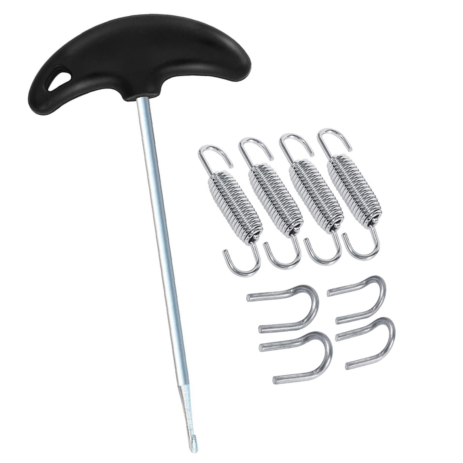 1. Material: Stainless steel 2. Color: black & silver 3. welding fasteners: approx.25mm x 17mm/ 0.98 x 0.67 4. Spring tube length: approx. 75 mm / 2.9 inches 5. Spring tube diameter: approx. 10 mm / 0.39 6. Total length of spring tension hook: 174 mm/6.8 7. Handle width: 87mm/3.4 8. Package weight: 200g 9. Quantity: 4 x exhaust springs, 4 x welding fasteners,1 piece of T-spring remover mounter. Please note: Due to manual measurement, the size may have slight deviation, please understand