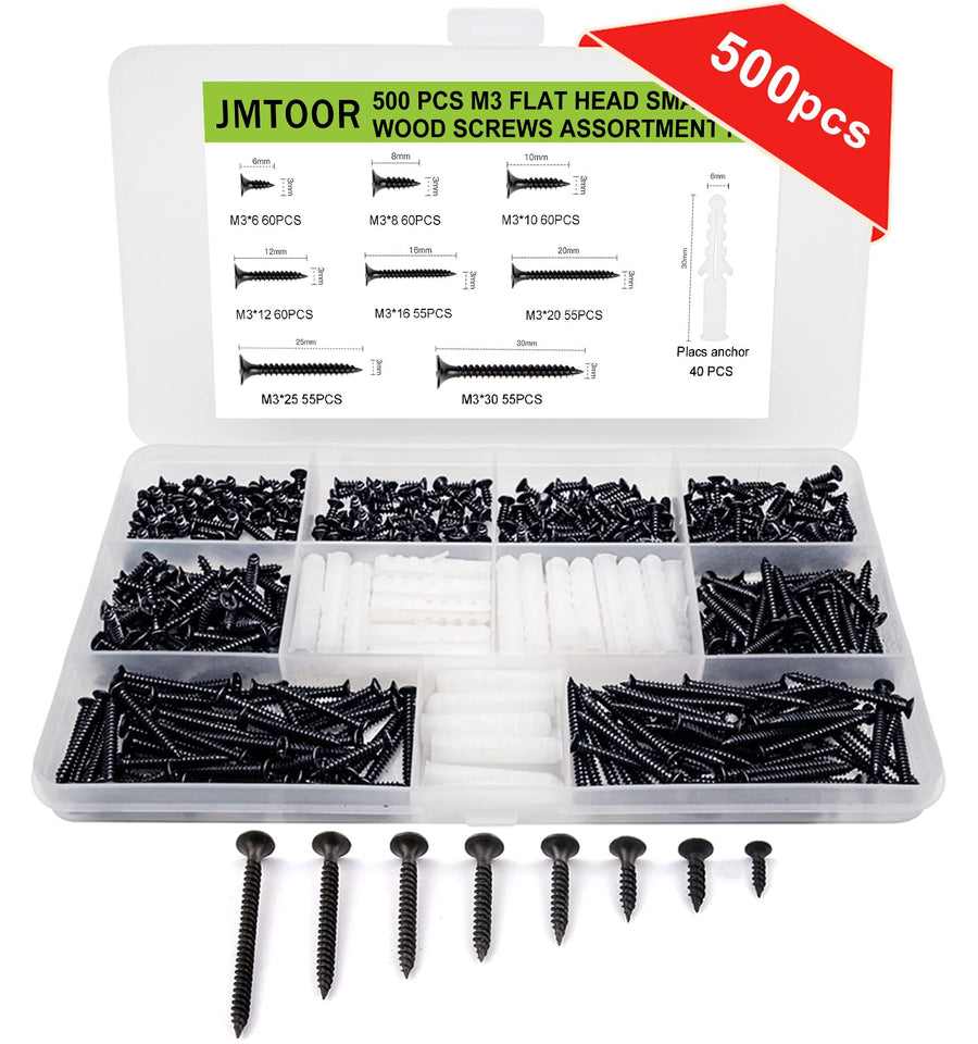 - Original Self-Tapping Screws – 500 Pcs M3 Flat Head Small Wood Screws Assortment Kit, Phillips Drive Countersunk Head Self Tapping Screws,Black Self Tapping Screws for Metal,8 Sizes Screws and 40pcs M6 Screws Anchorss by JMTOOR
