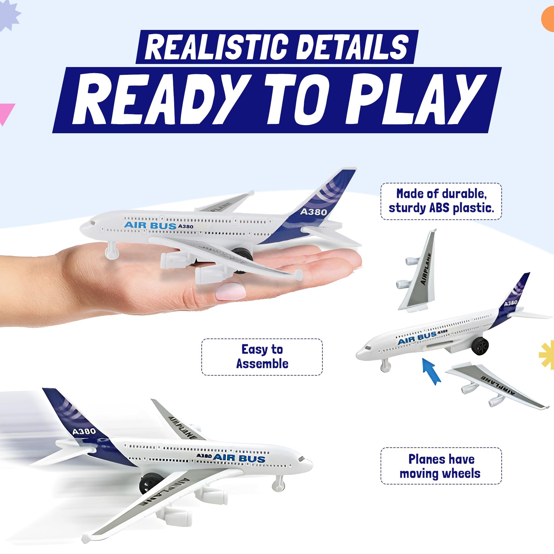 - KID FRIENDLY DESIGN: The toy airplanes & cars measure between 4“ to 10. Planes have moving wheels so they can be easily pushed around. Great realistic and color design. No batteries needed, ready to play right out of the box.