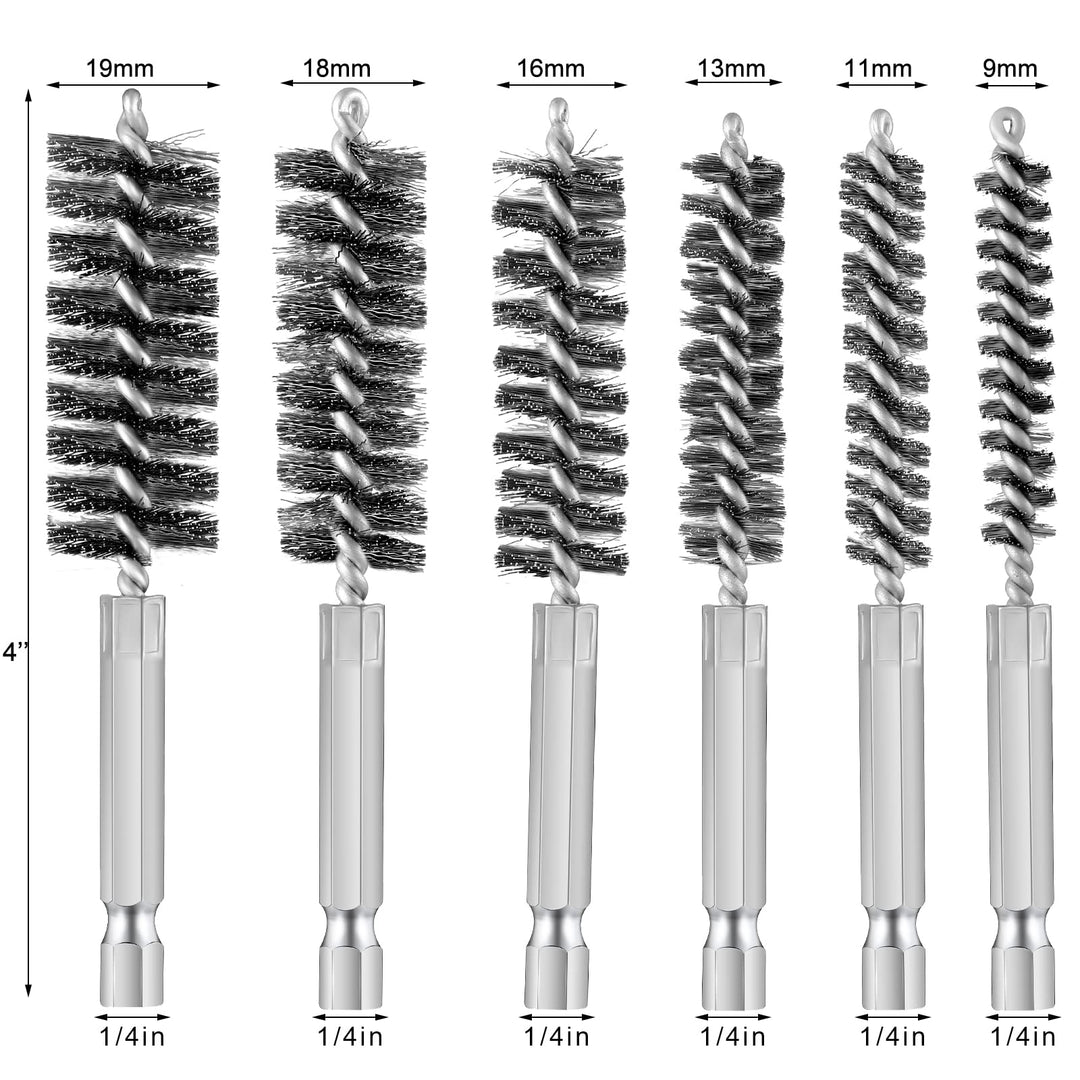 - Multi specifications: there are 6 different sizes of twisted wire stainless steel bore brushes, including 9 mm, 11 mm, 13 mm, 16 mm, 18 mm and 19 mm in diameter; Each brush has 4 inch in length and 1/4 inch hex shank to be mounted on any power drill or die grinder (not included