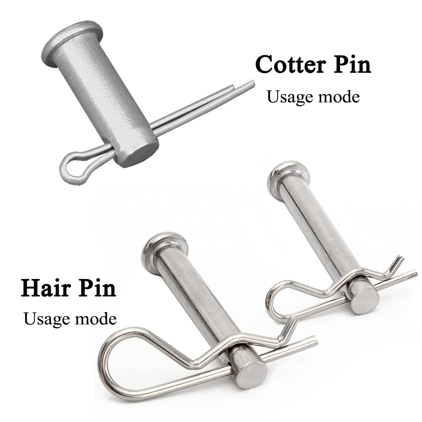 - Easy to Use: The R shape hair pin design, insert into hole directly and it can lock the bolt fast and effectively; for the cotter pins, Insert the cotter pin into the hole of the bolt until the head of the pin rests against the bolt. Then secure the cotter pin by spreading the prongs in opposite directions