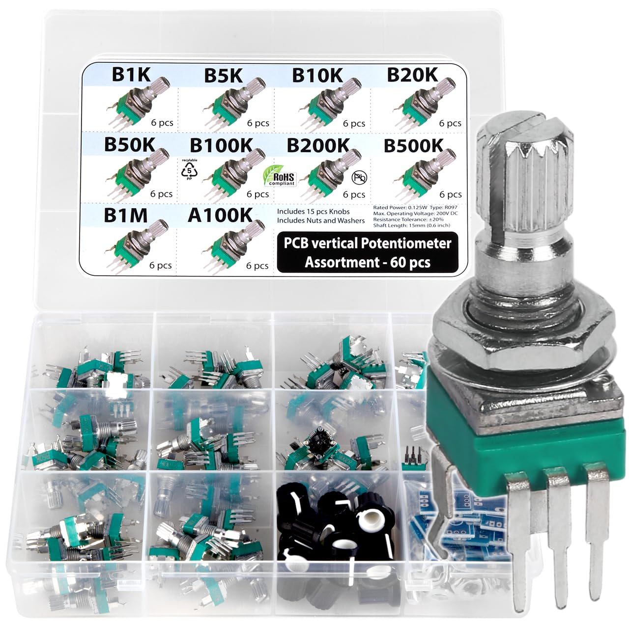 - Original Potentiometers – 60 pcs Small 9mm onboard PCB Potentiometer Assortment 10 Values, B1K, B5K, B10K, B20K, B50K, B100K, B200K, B500K, B1M and A100K, Vertical Legs Terminal, 15mm axis, RV097 SMD by 3pdt