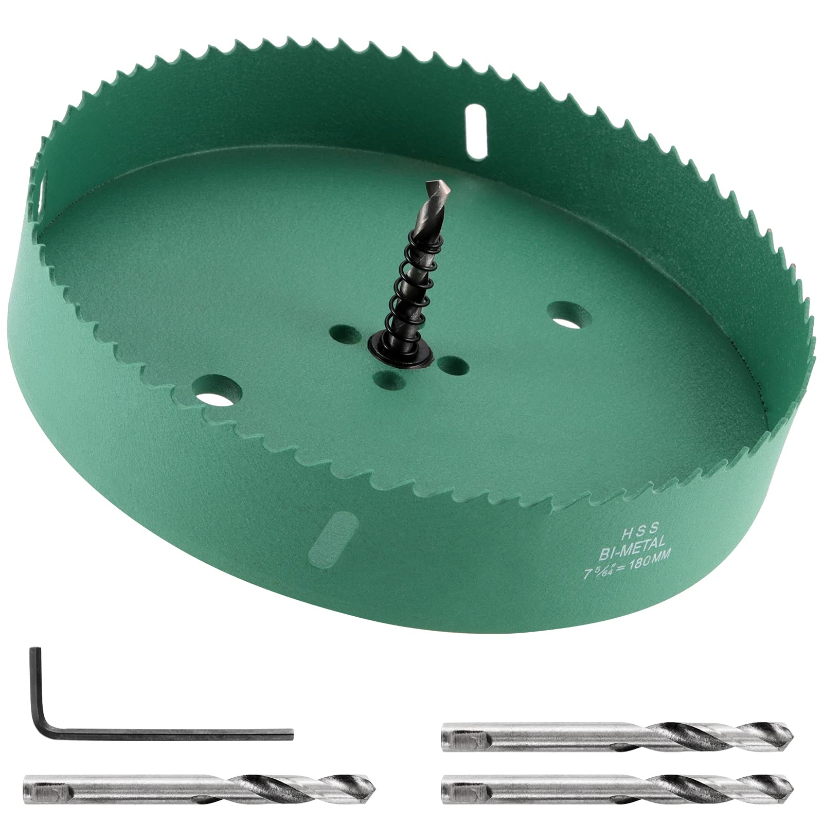 - ?1 SET IS DONE? With this hole saw set, everything can be done! The package includes 1 x (180mm) hole saw, 1 x heavy duty center hex shank arbor, 1 x Allen wrench and 4 x drill bit. The Cutting diameter is 7 inches and depth is 1.5 inches.