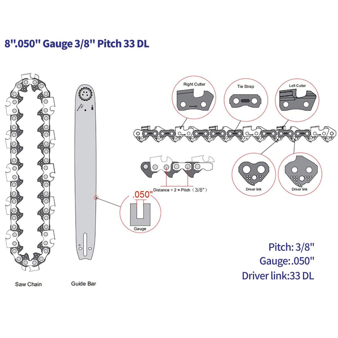 - Chain is for 8 ''bar( fits Portland 9-1/2 in. bar), .050 Gauge, 3/8 LP Pitch, 33 Drive Links Semi-Chisel Low Kickback(The same saw can be equipped with different bar lengths. Please verify your parameters to ensure this chain works with your machine.)