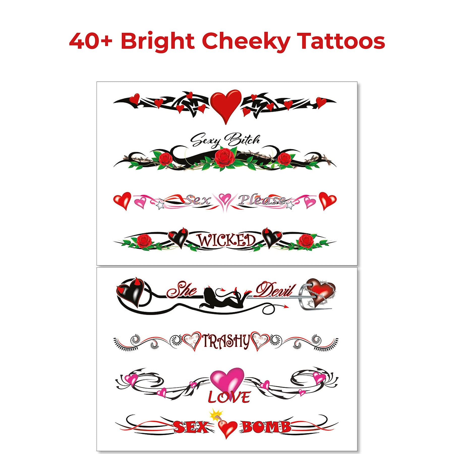 - EXCLUSIVE COLLECTION - unique saucy and feminine adult temporary tattoos with colorful designs - “Sex Bomb”, “She Devil” Wicked, Sexy Bitch, hearts, roses and more suggestive stickers! Great as gifts as lower back tramp stamp temporary tattoo for women, a sexy armband or to add to slutty dresses. Our hotwife temporary tattoos are fun sexy accessories for sex play sexy tattoos for women