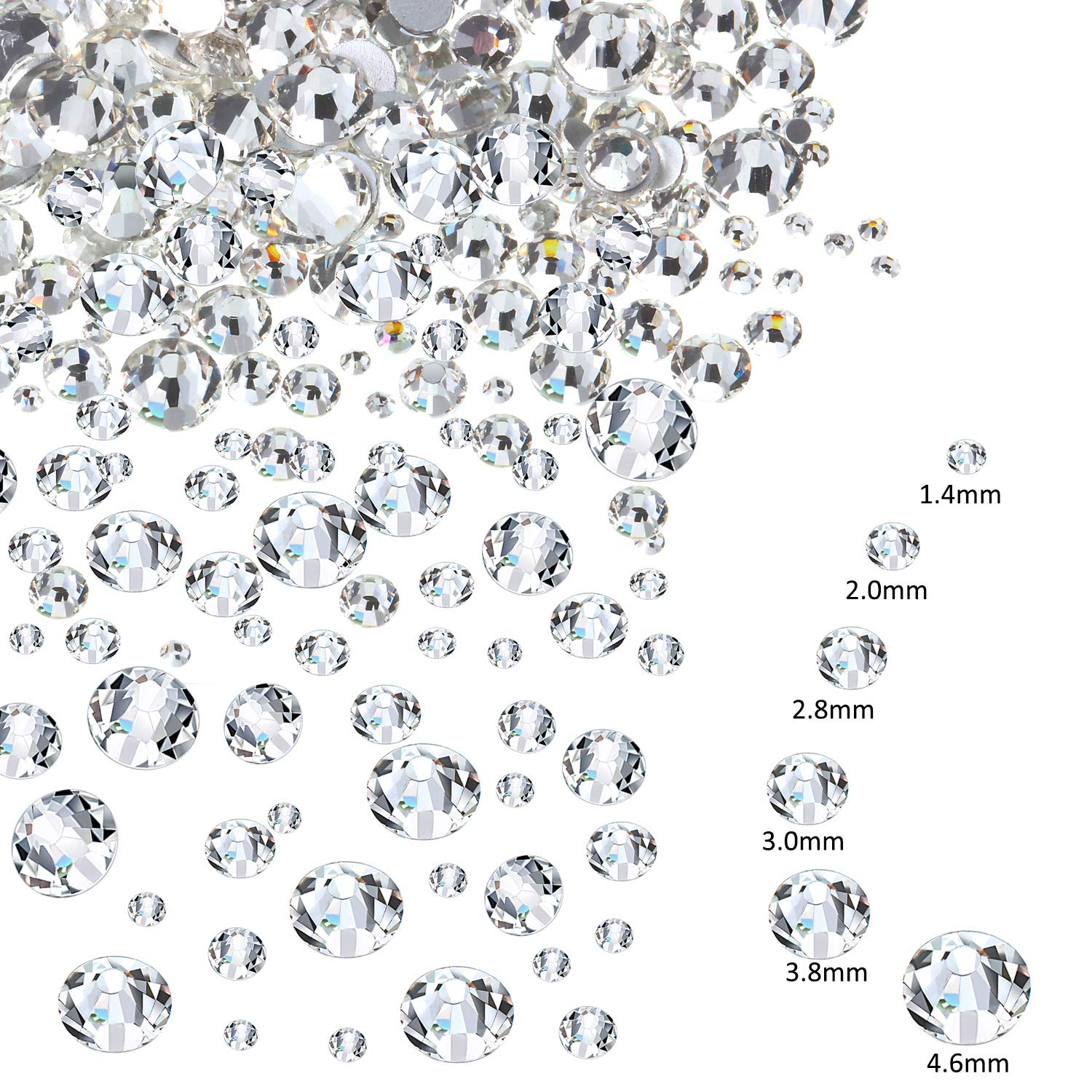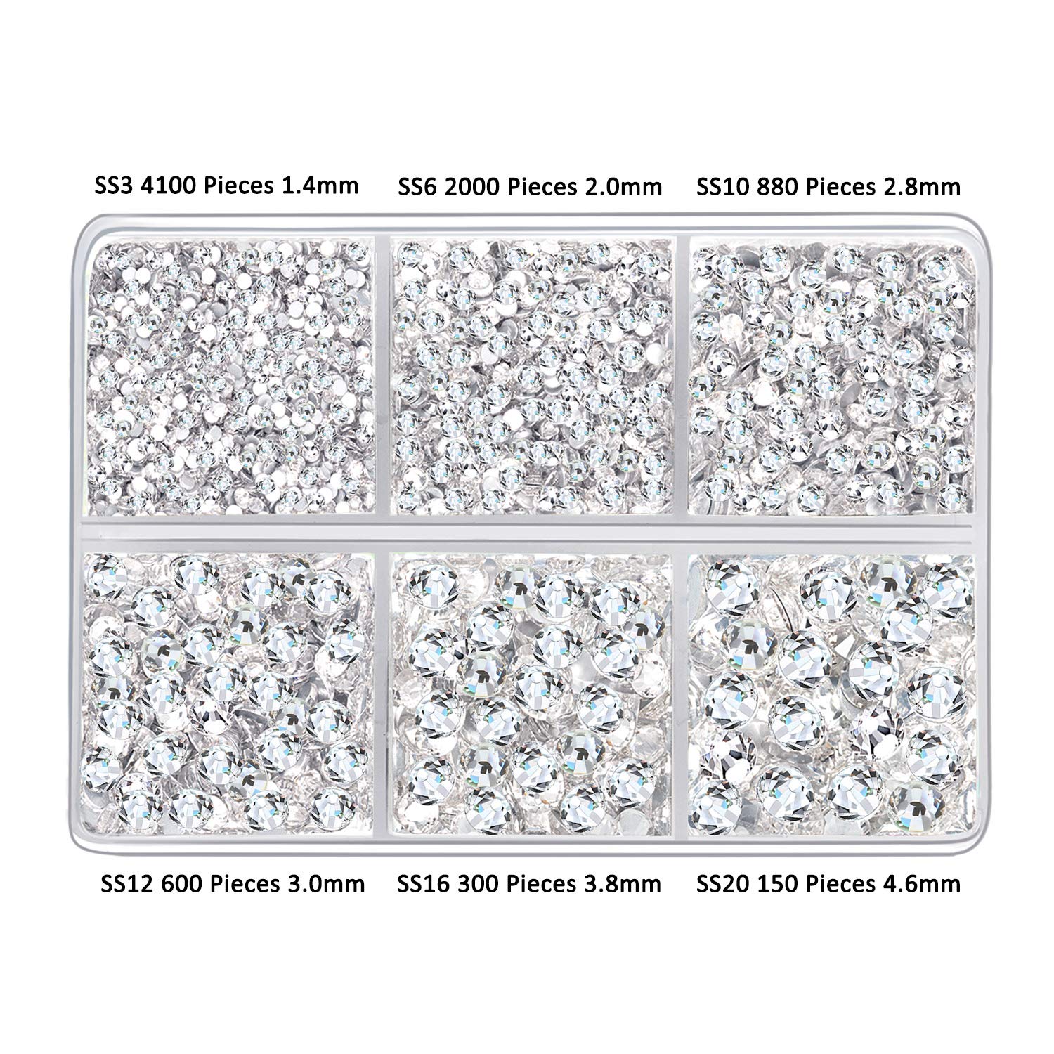 - 6 Assorted sizes: these gems rhinestones in 6 different sizes, like SS3: 1.4 mm, SS6: 2.0 mm, SS10:2.8 mm, SS10:3.0 mm, SS16:3.8 mm, SS20:4.6 mm, the number of 1.4-2.8 mm gem stone is about 6980 pieces, and the others are about 1050 pieces for each size